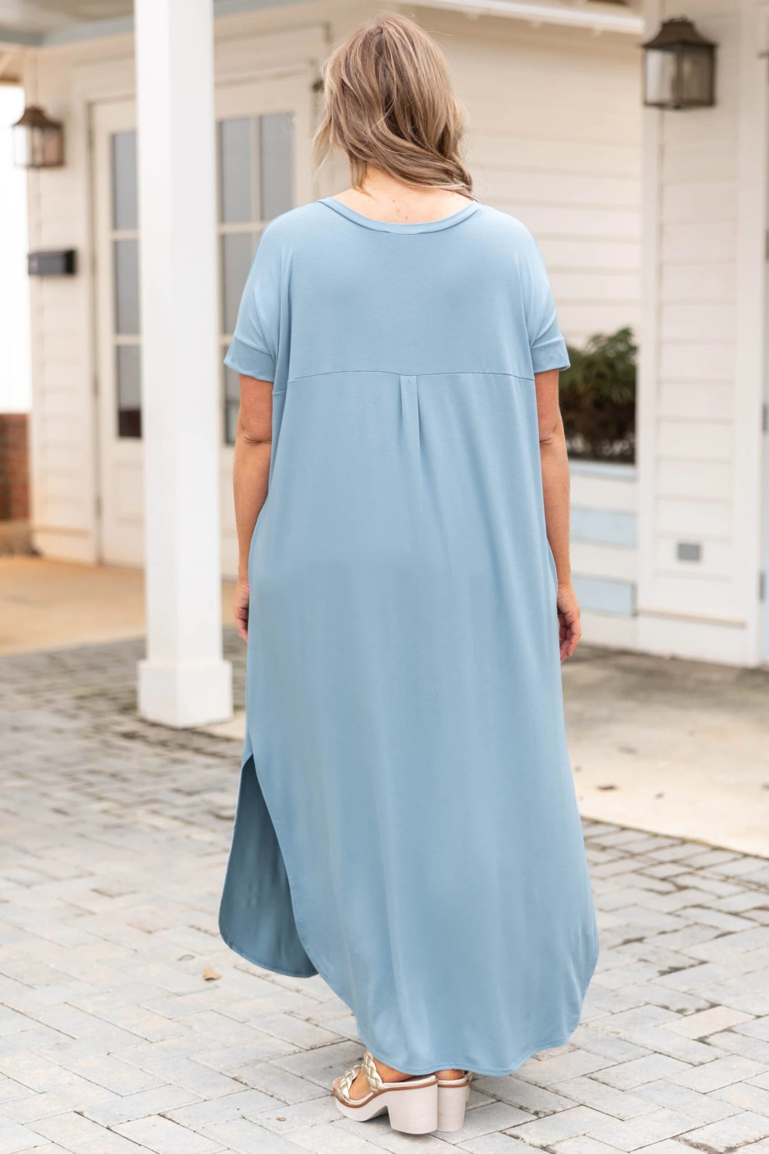 The maxi you’ll be wearing ALL summer long!! The blue gray color is super sweet! It’s ultra comfy and so soft!! The relaxed, flowy fit makes it perfect for hot days and nights!! Pair it with heels and a bold necklace to complete the look!