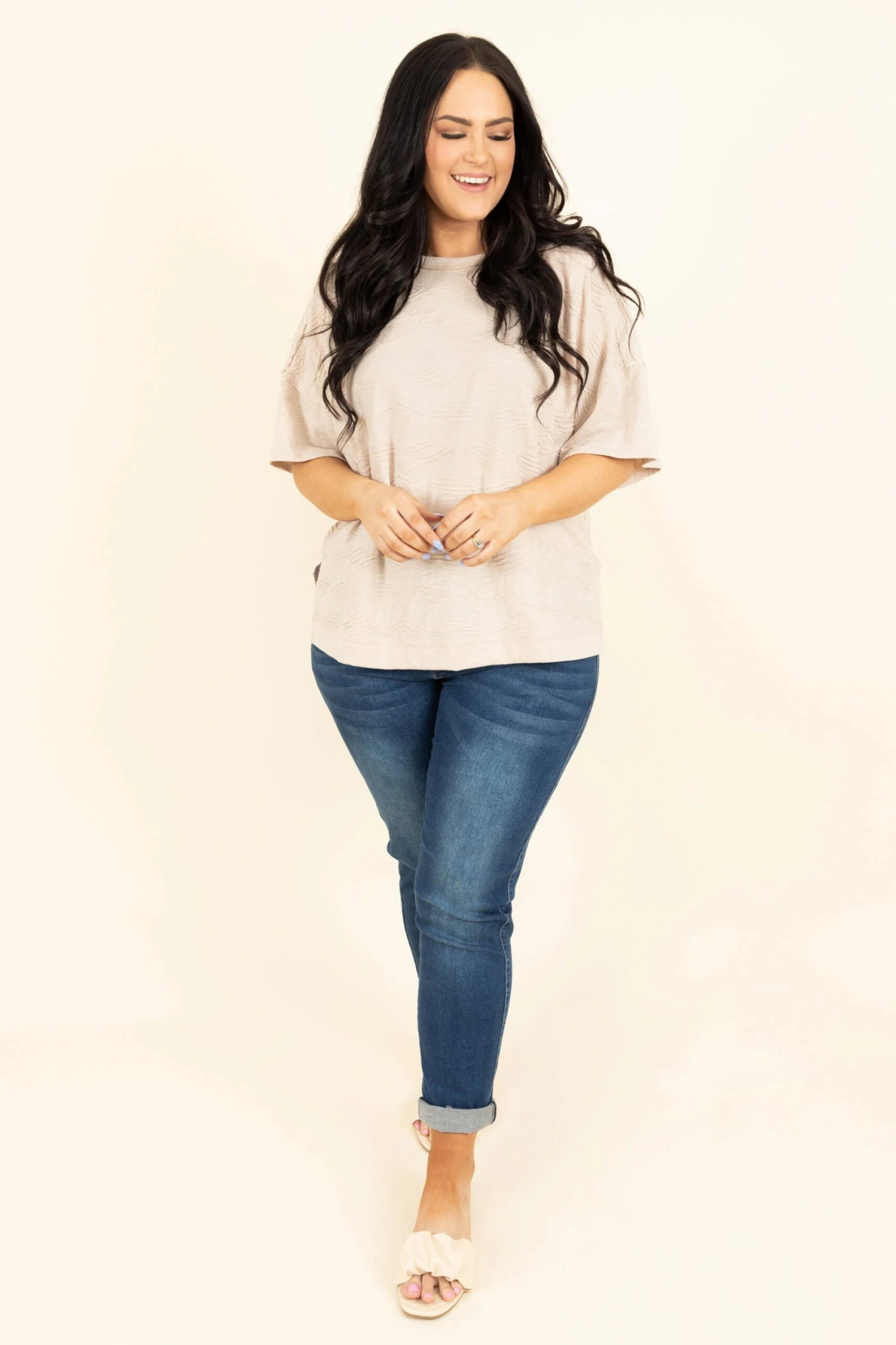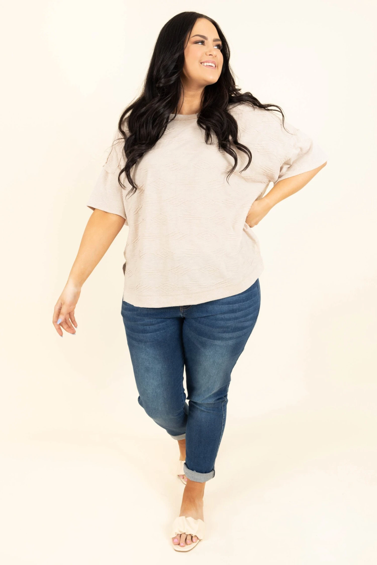 Add this beauty to your wardrobe for the season! The neutral taupe color and super sweet Aztec pattern is so chic! The stretchy, figure flattering fit is perfect for a casual day out on the town! Style this top with shorts or skinnies for a classic chic look!