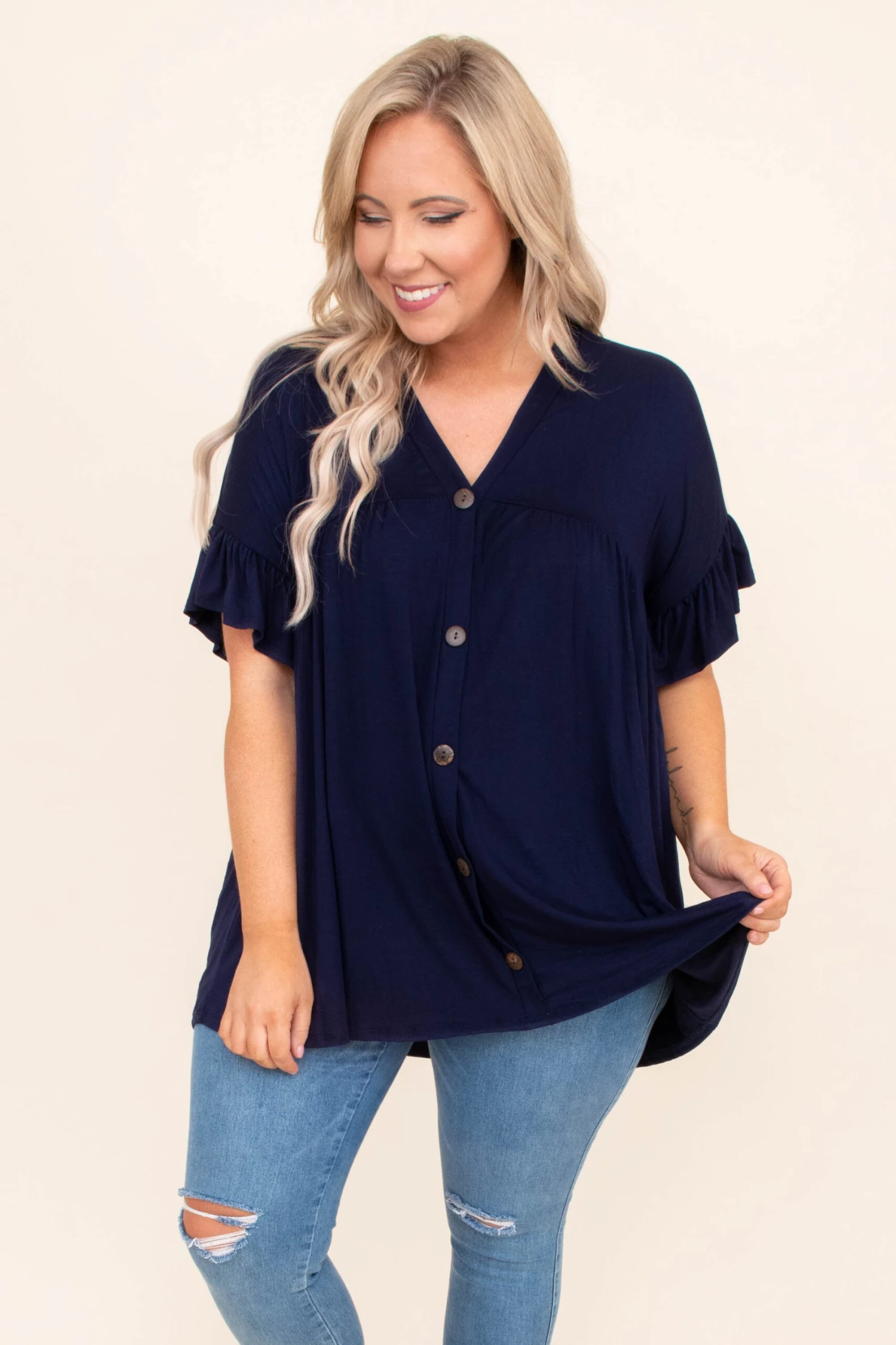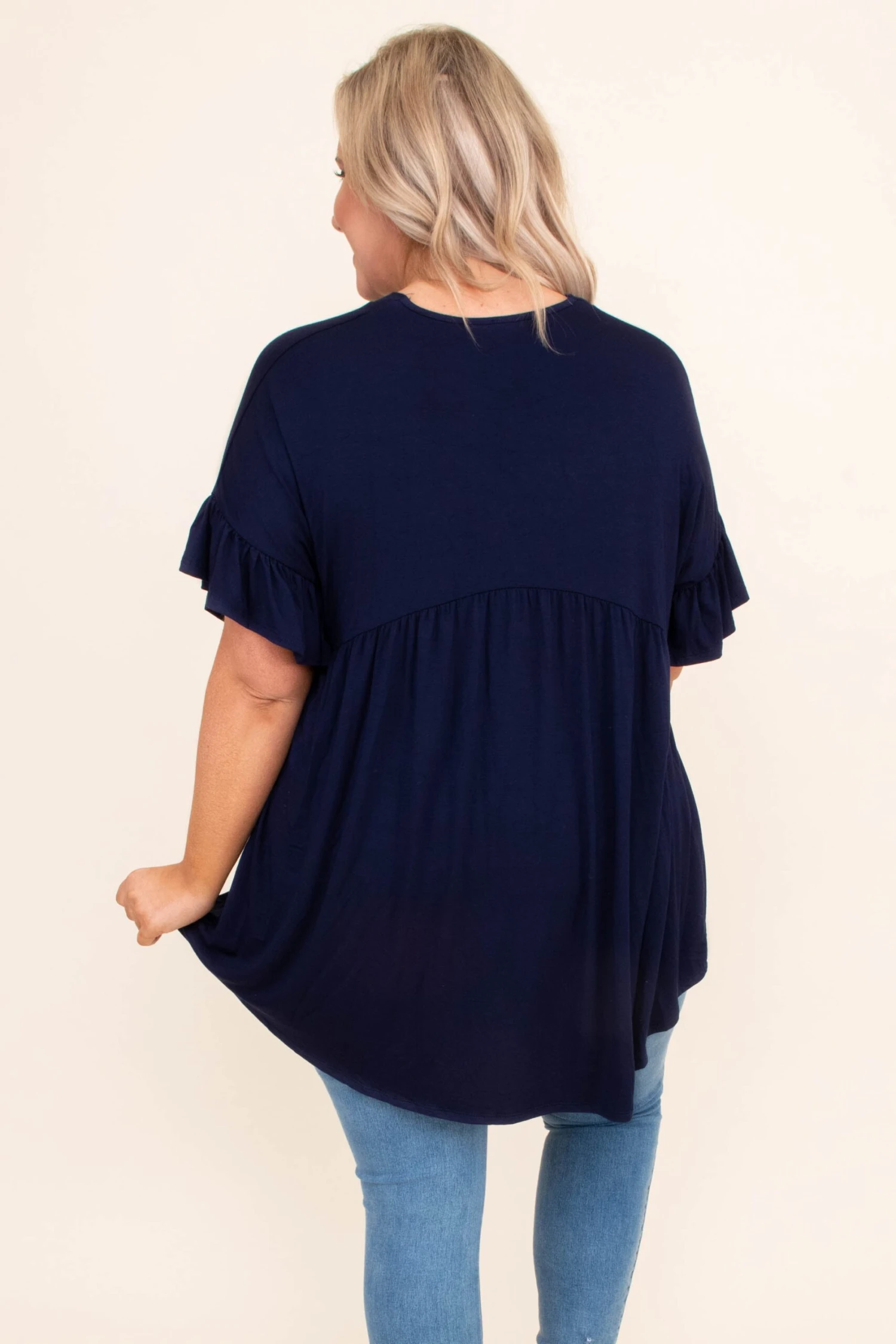 This top is too sweet! It has a flirty and feminine design with a figure-flattering fit you’ll want to wear all day long! It’s light and flowy and has the cutest ruffled sleeves! Not to mention how easy the solid navy color is to pair with your favorite accessories! Style this top with skinnies and wedges for an effortlessly chic look!