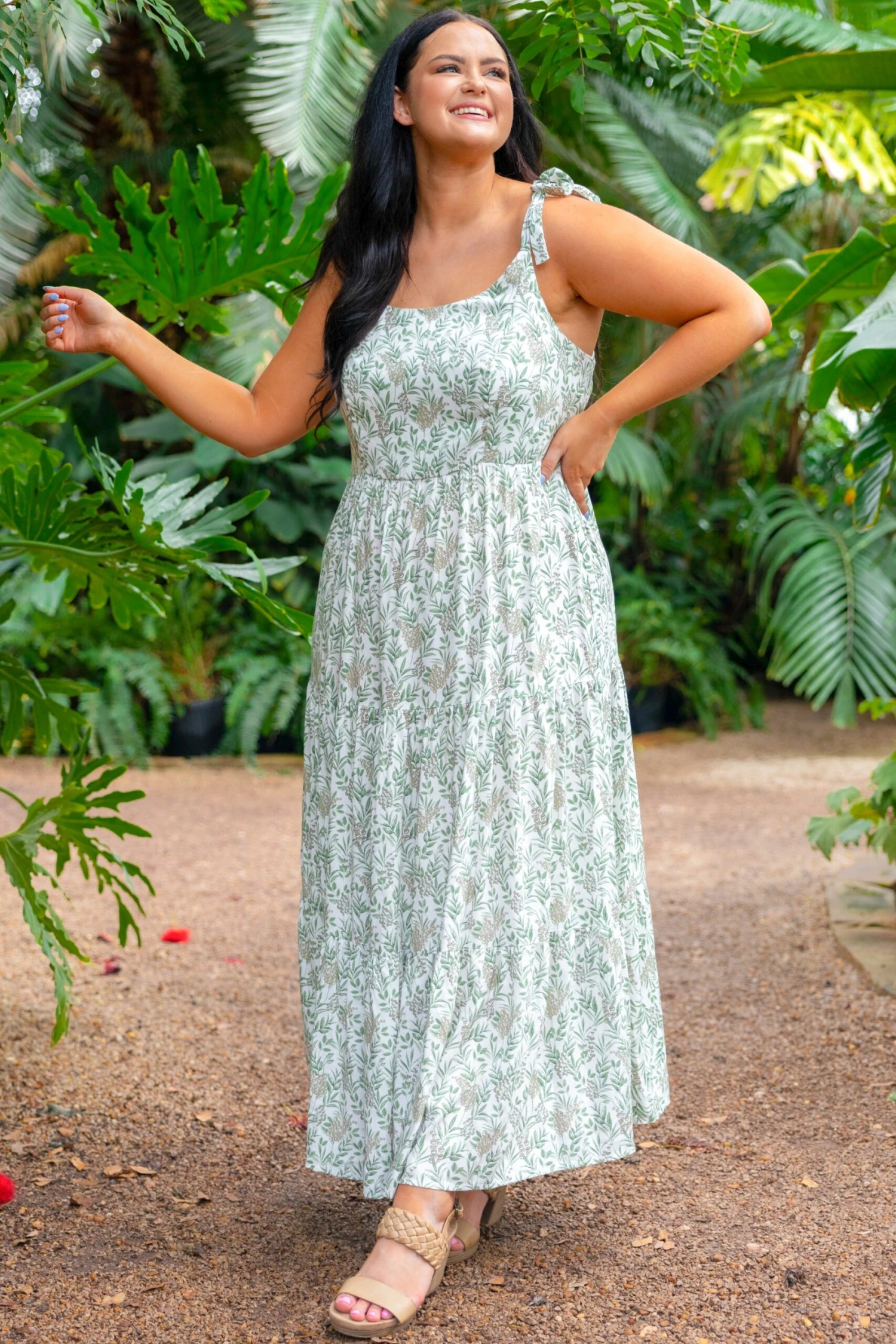 Enter summer in style with this fabulous dress! This timeless piece features shoulder ties, a maxi length and a beautiful cream-olive color with a sweet floral pattern! Made of lightweight, breathable fabric, this dress is perfect for an outdoor picnic date or a leisurely stroll in the park!
