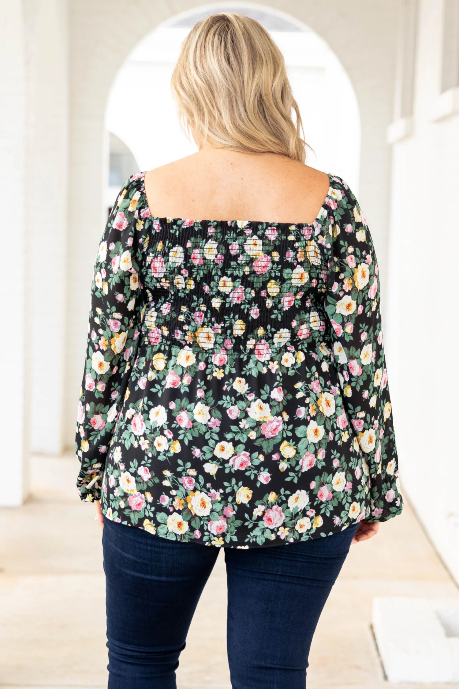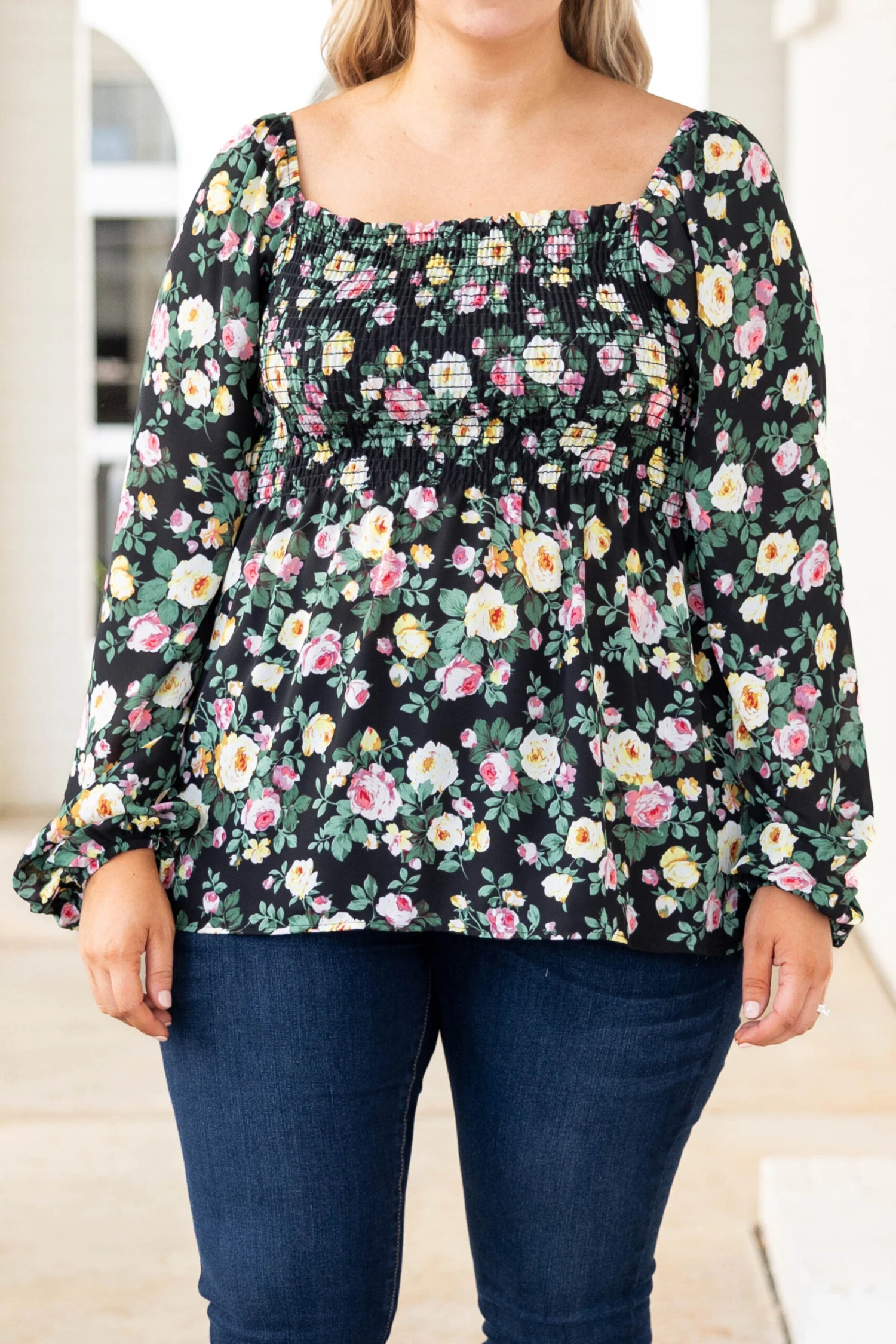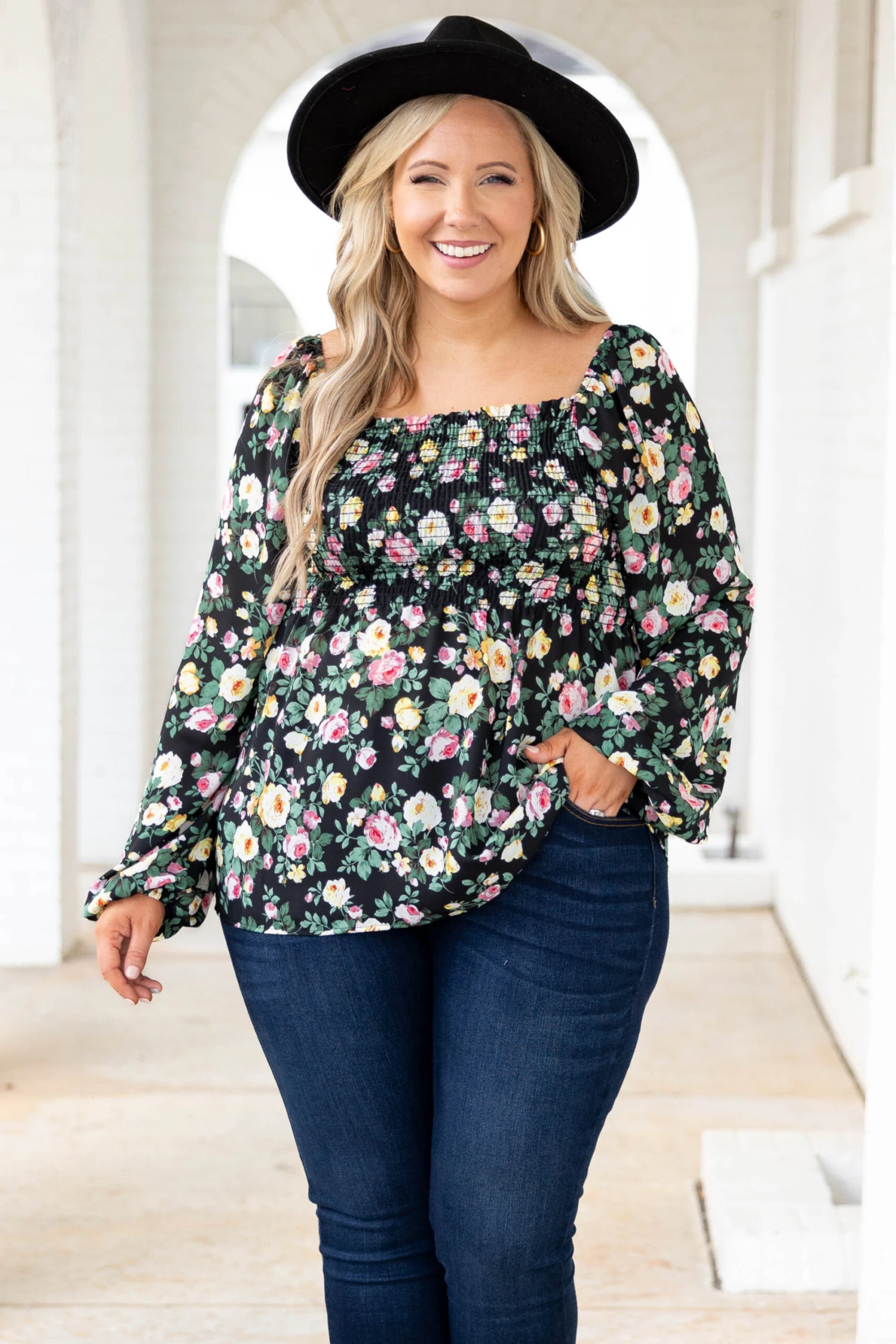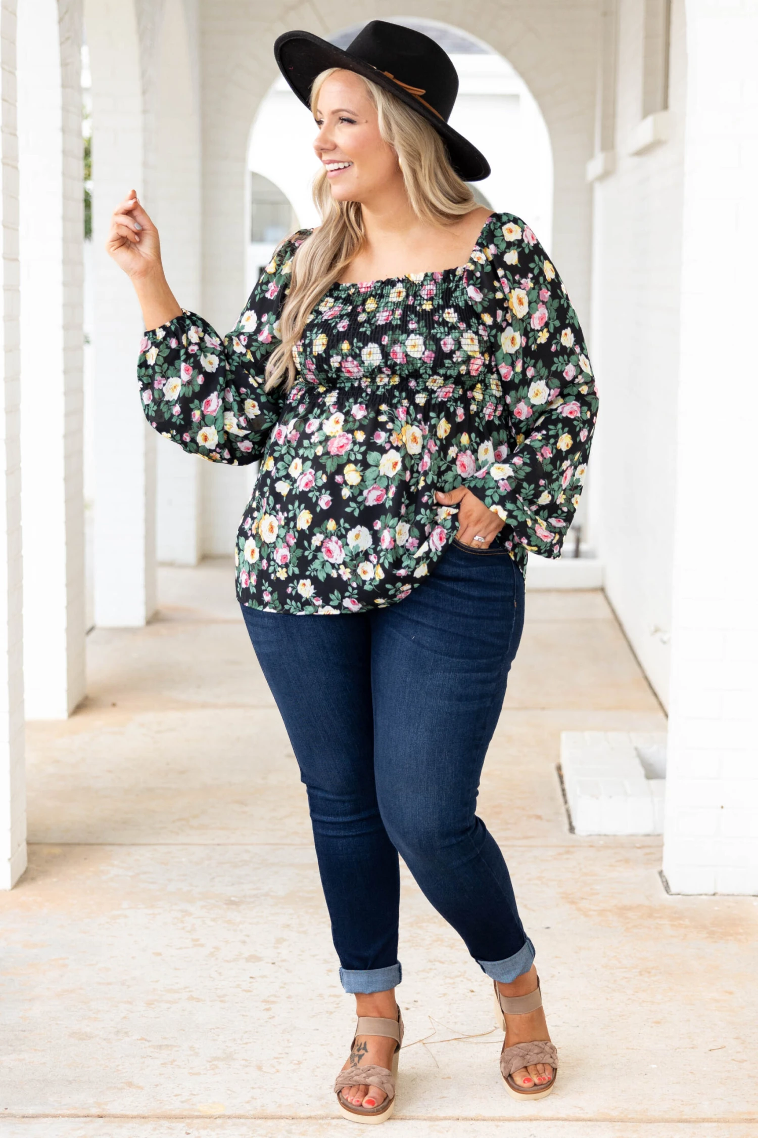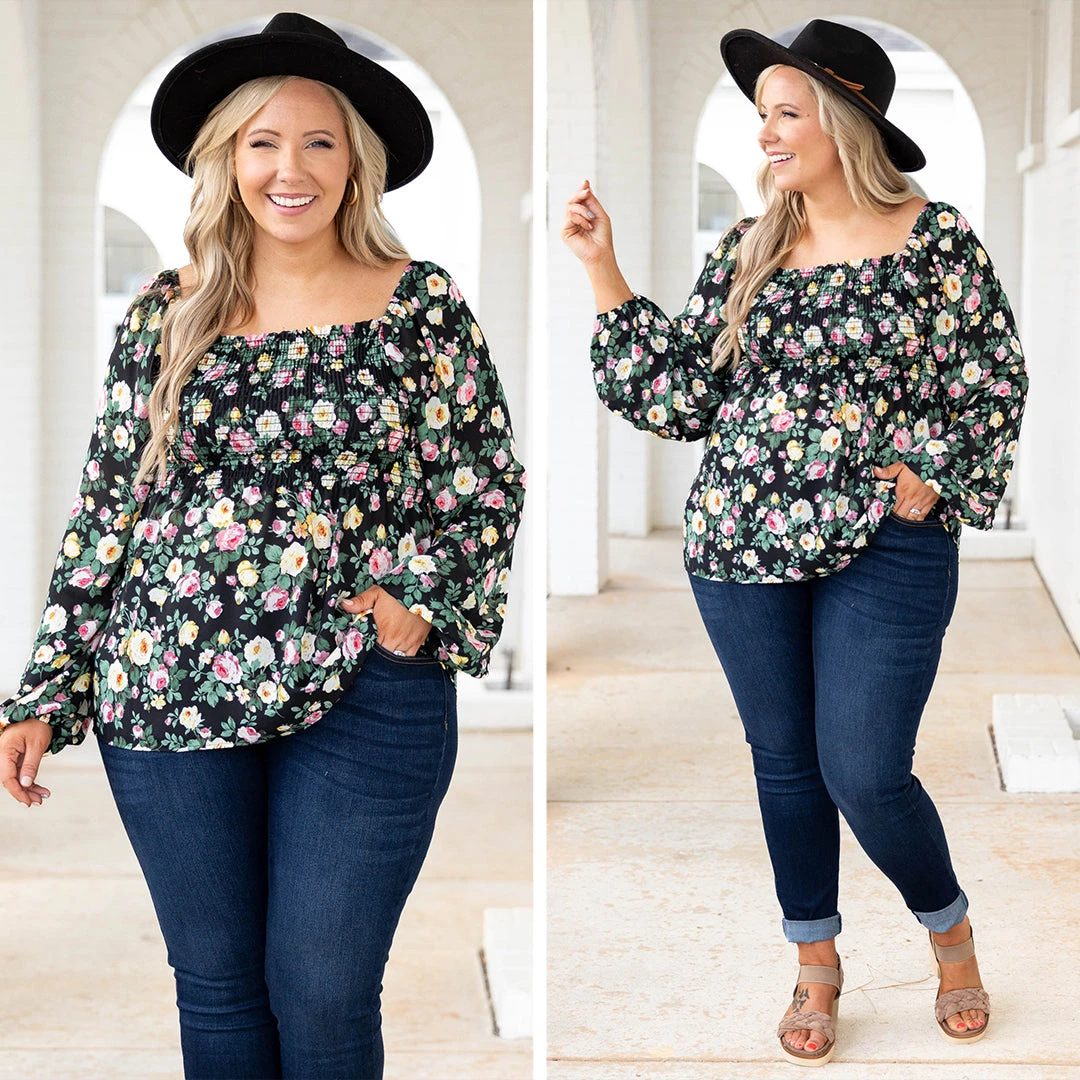 This top is perfect for all your busy nights out! It has a sweet floral print and a flattering smocked top, This stunning blouse would look great paired with skinnies and heels this season!