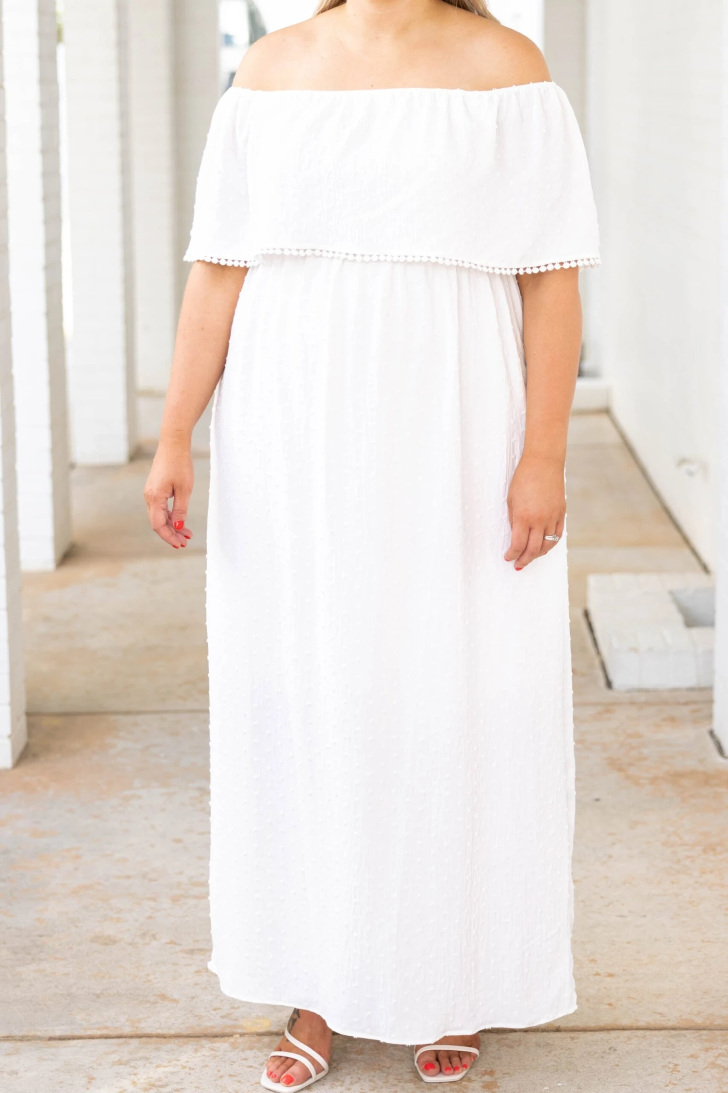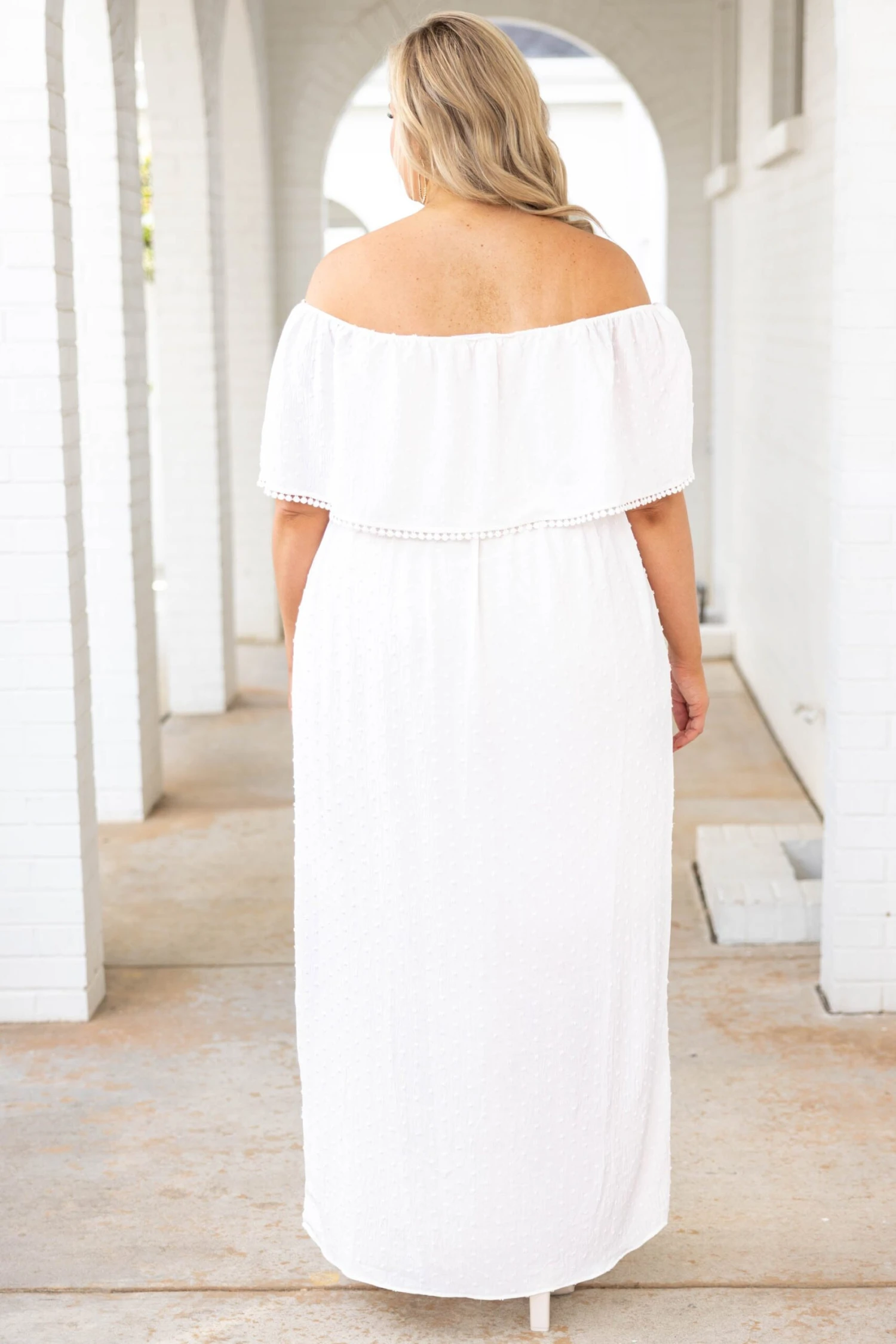 Get carried across the threshold in this dress! The white color is so fresh and bright and the raised dot pattern is so stylish! We love the embroidered details on the off-the-shoulder neckline that give this a fun pop! Style this with some sandals for a super cute look!