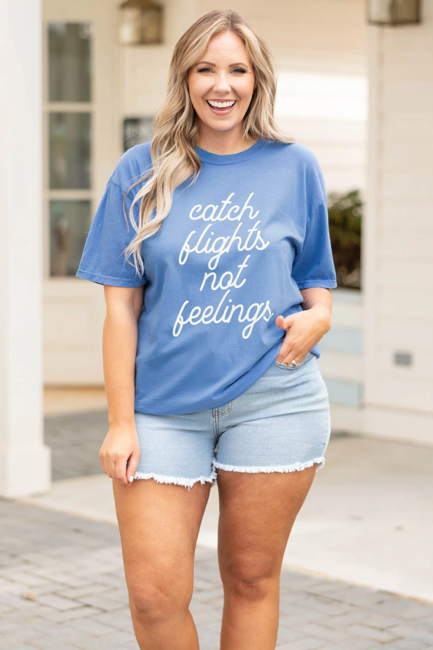You can catch flights and feelings in this adorable tee! This tee has a gorgeous mystic blue color with a simple graphic that is so sweet! The classic t-shirt fit is perfect to pair with your favorite shorts or skinnies for a casual chic look!