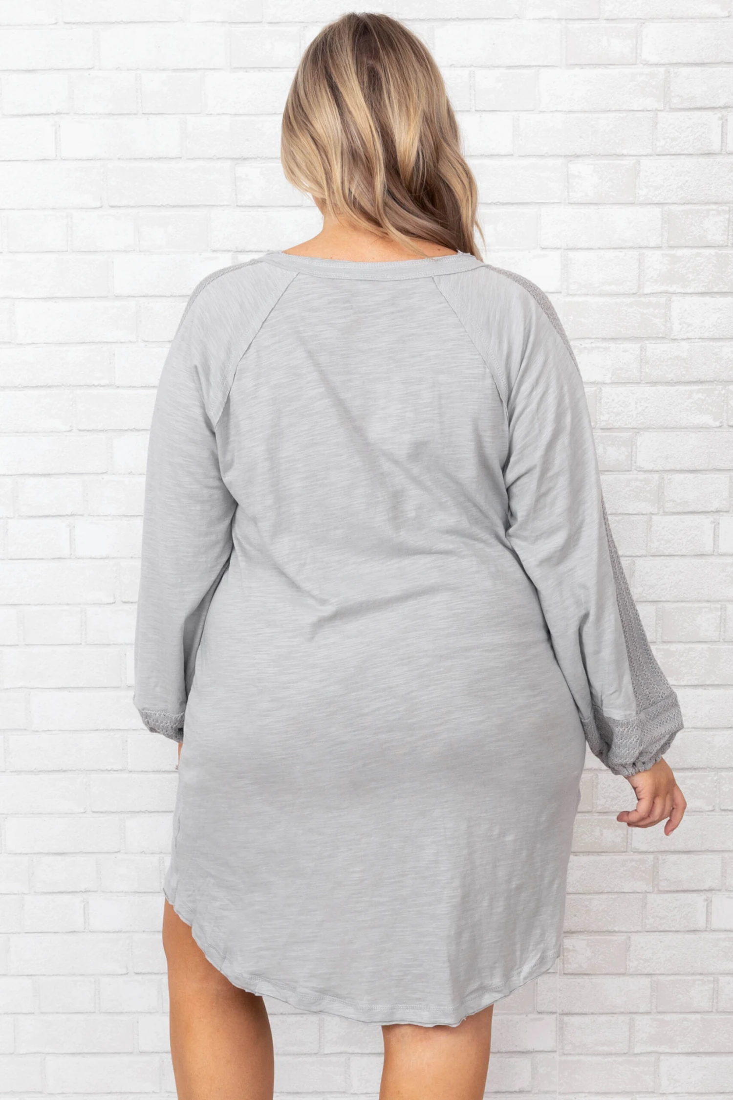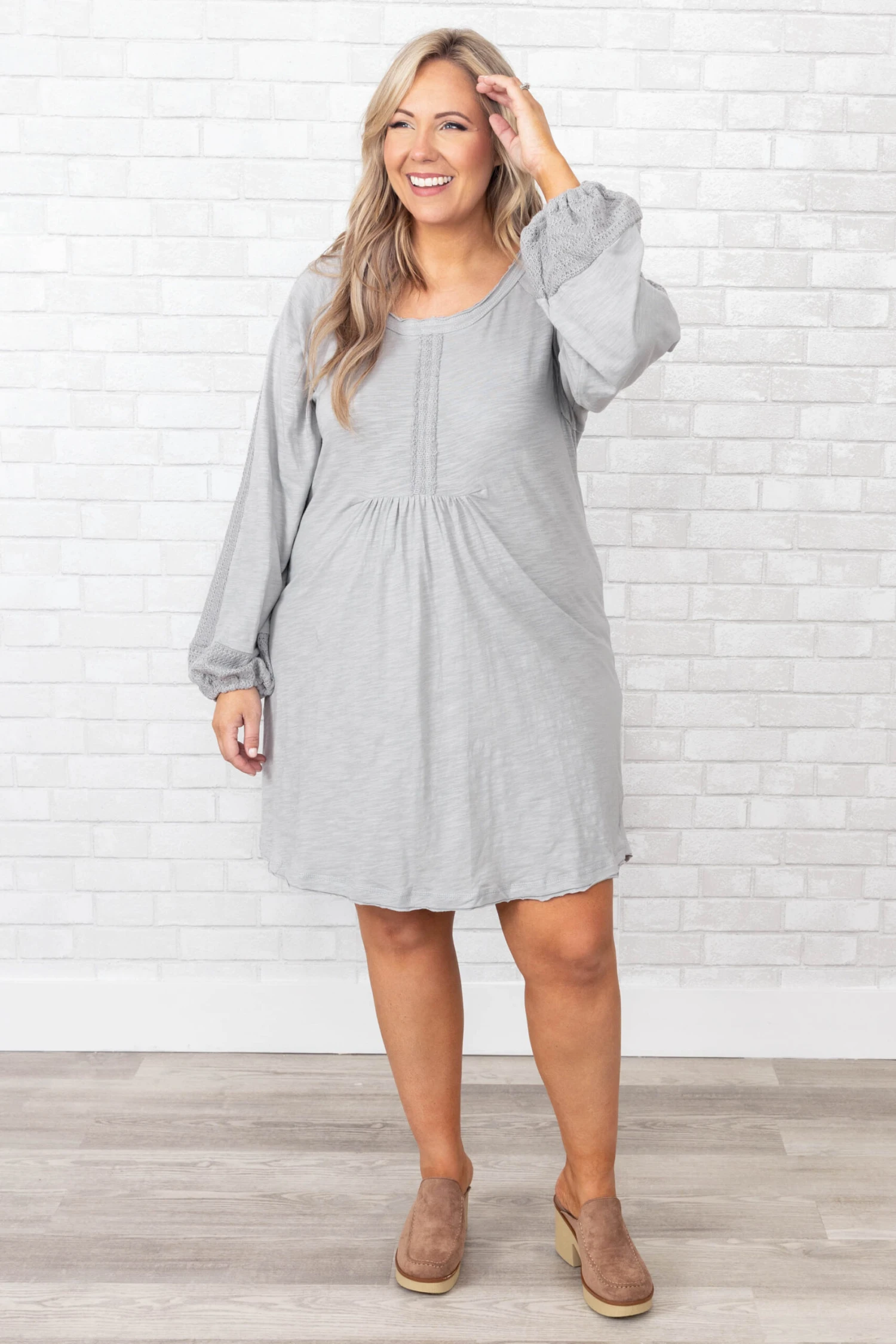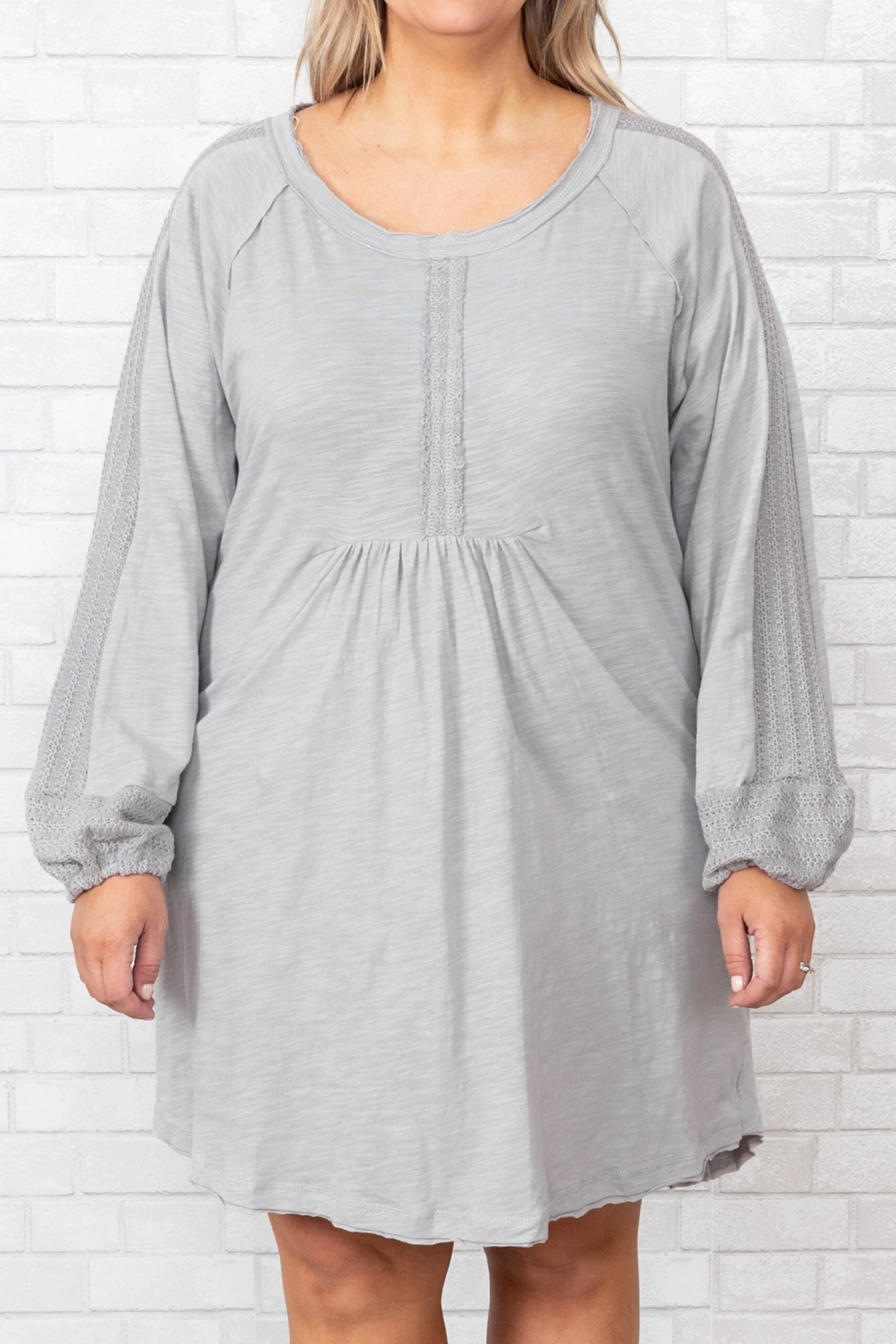 This dress would be the perfect addition to your wardrobe! It features a cool textured crochet detail on the sleeves, trendy raw hems and a super flattering fit. Style this cutie with your fave accessories and booties for a chic outfit this season!