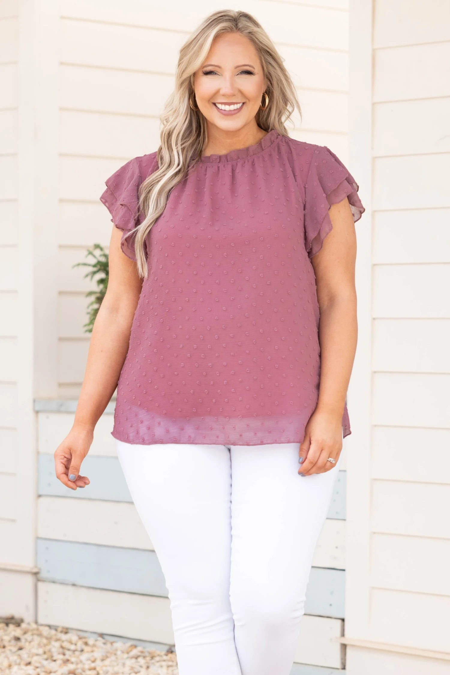 This top pops off the charts! This top has a solid vintage berry color with a textured fabric we adore! It’s easy to style, has a figure-flattering fit, and features an attached under-lay for the ultimate look! Style this blouse with skinnies and sandals for your next event!Â