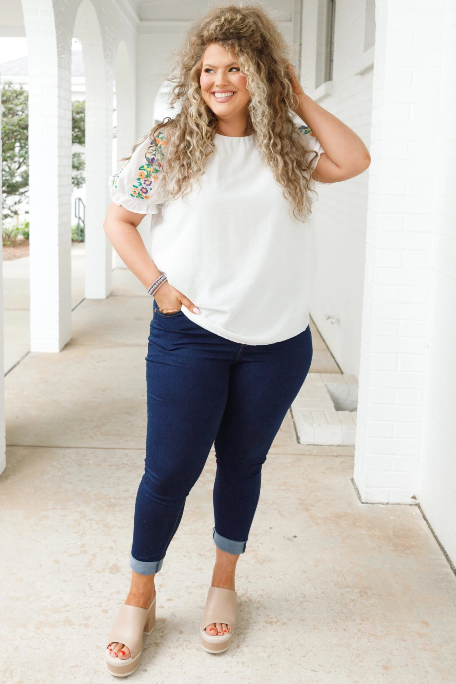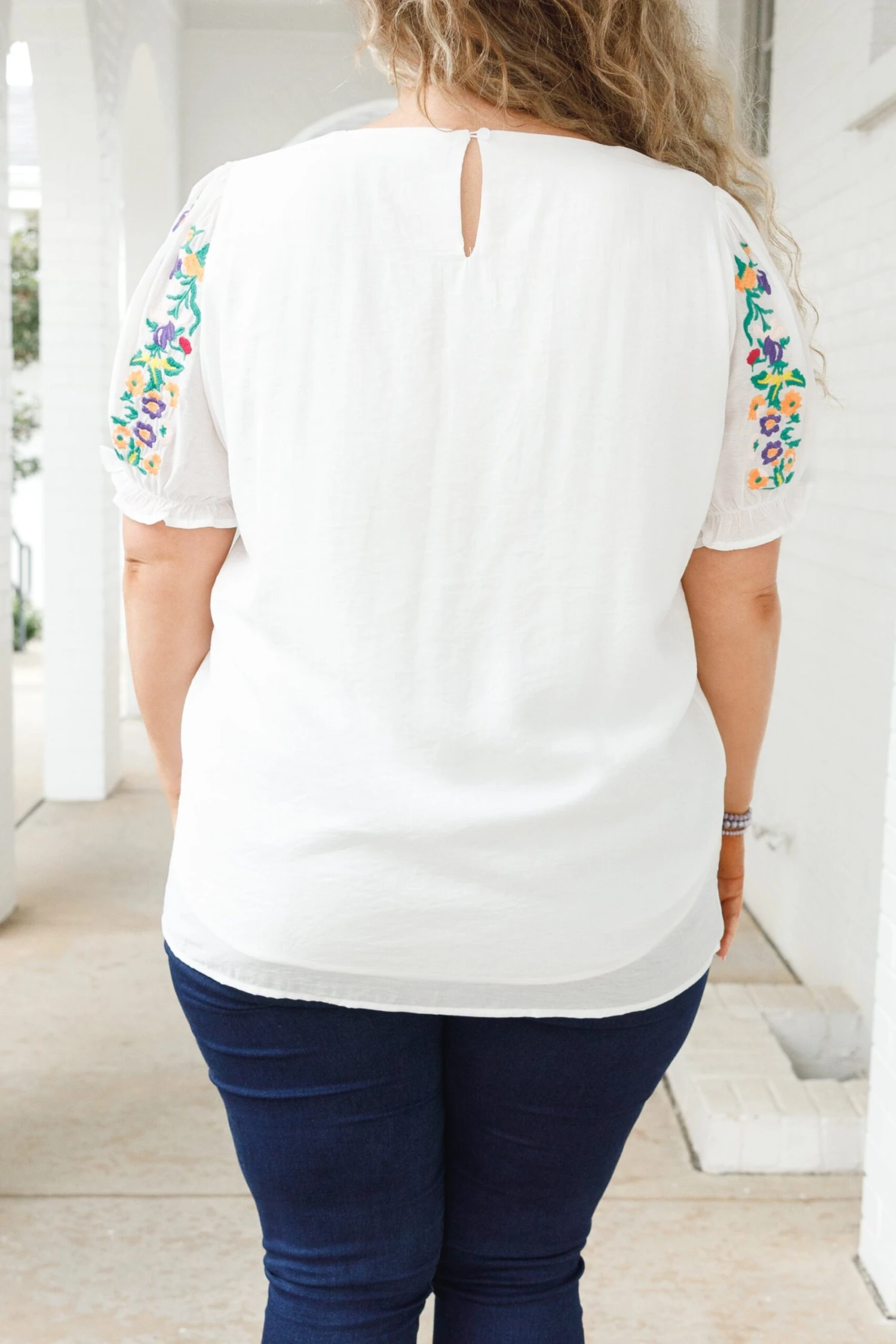 This top was made with you in mind! It features a classic white color with a trendy embroidery design along the sleeves that is oh so chic! The flowy fit pairs well with your favorite skinnies and accessories for an unforgettable look!