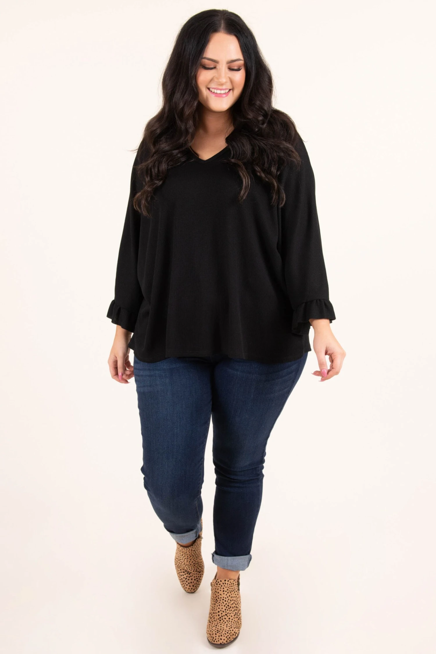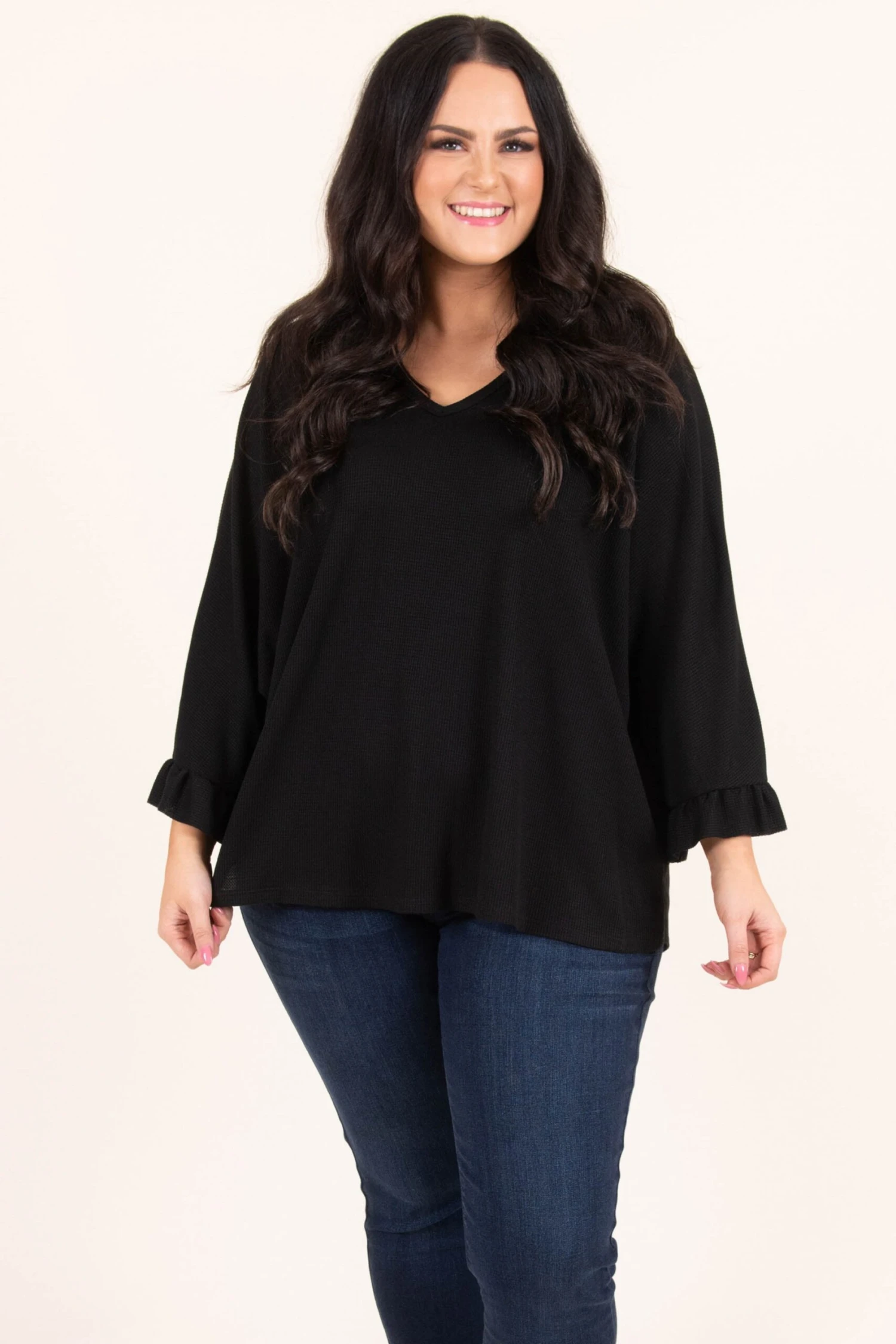 The possibilities are endless with this adorable top! This top has a neutral black color and lovely ruffles around the sleeves! The sweet neckline and flowy fit are just in time for the season! Simply style this top with some skinnies and cute accessories for a casual, chic look!