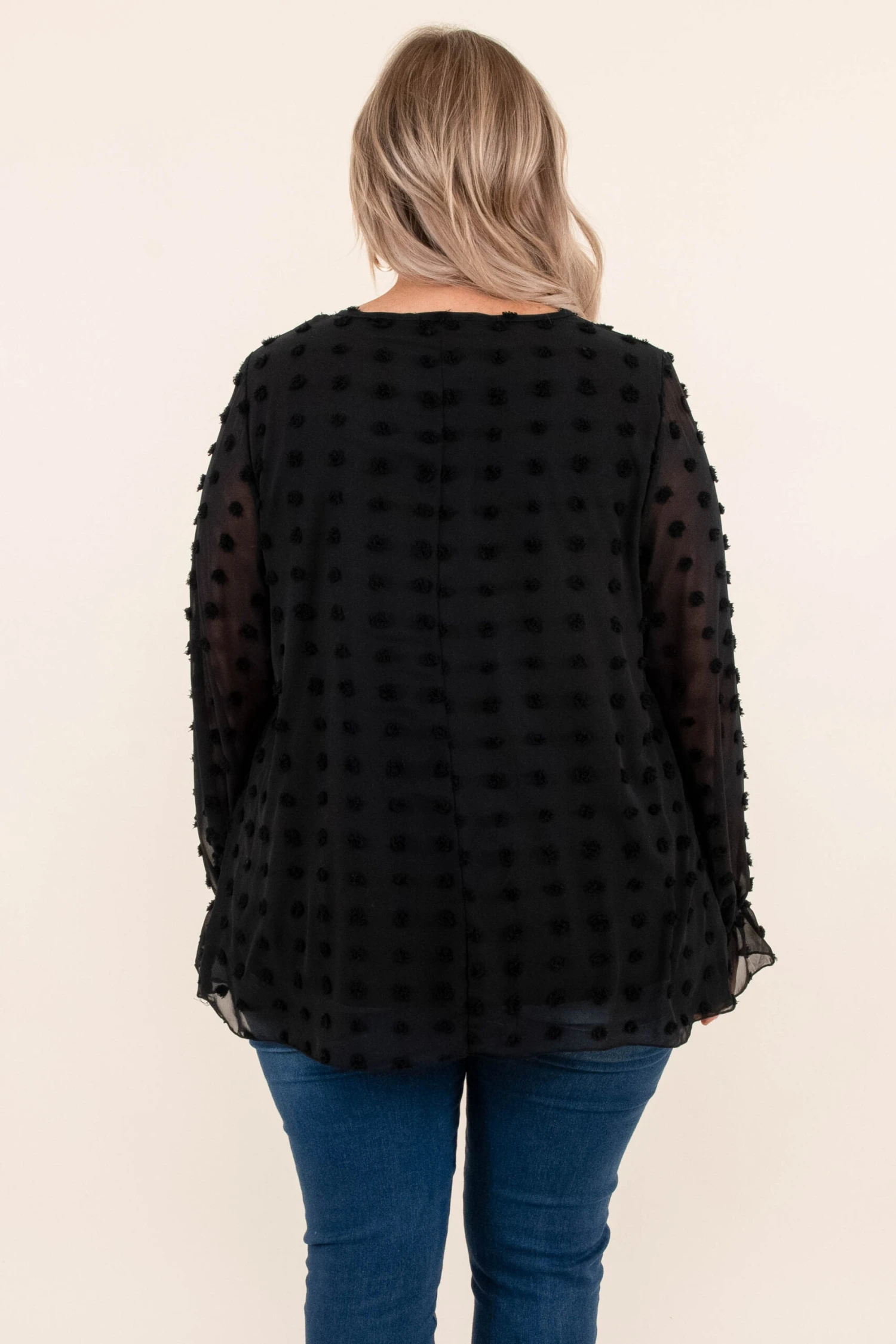 This is the perfect addition to your wardrobe this season! It has a classic black color, textured swiss dots and is so elegant. Pair this with jeans, booties and a chic bag for the best style!