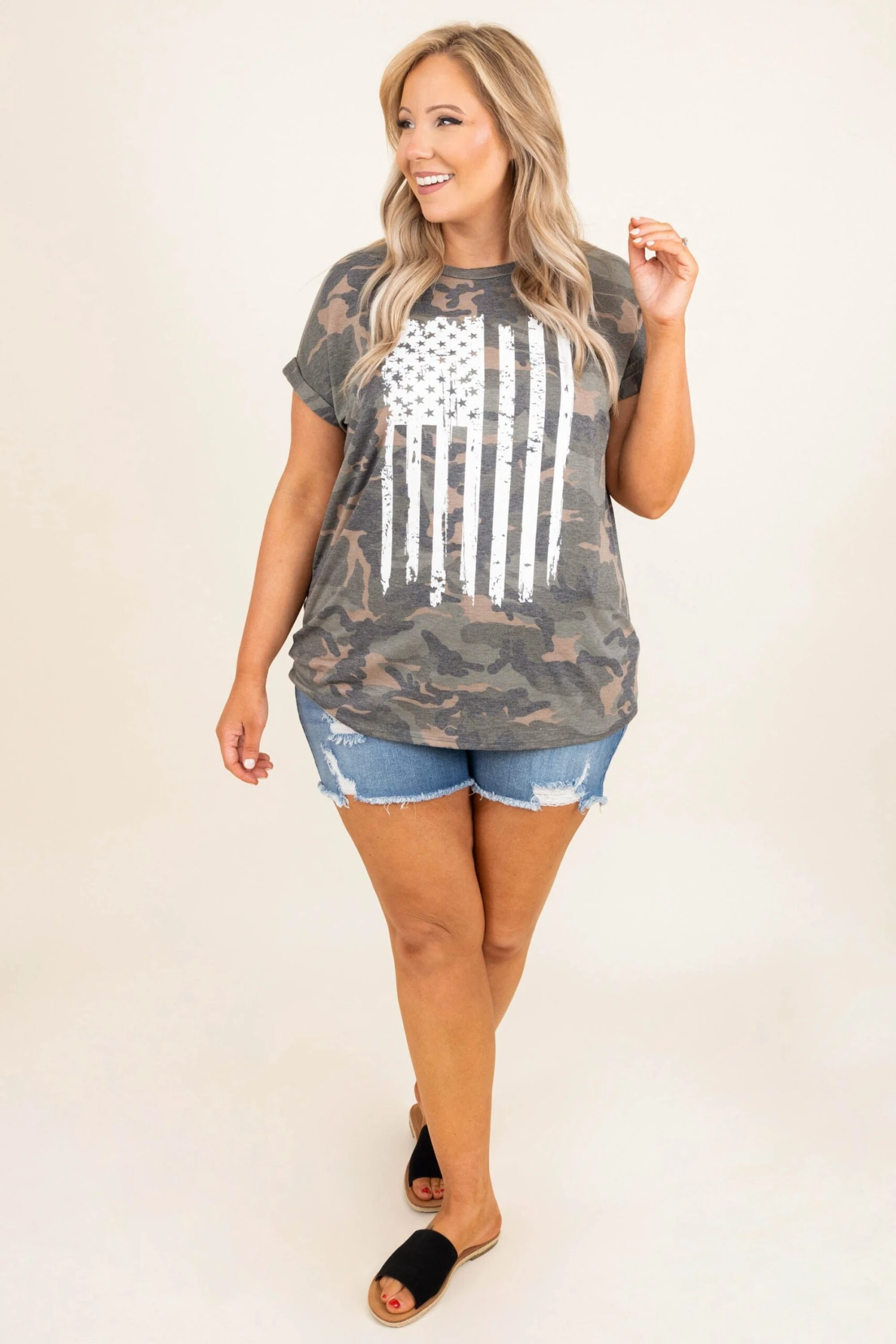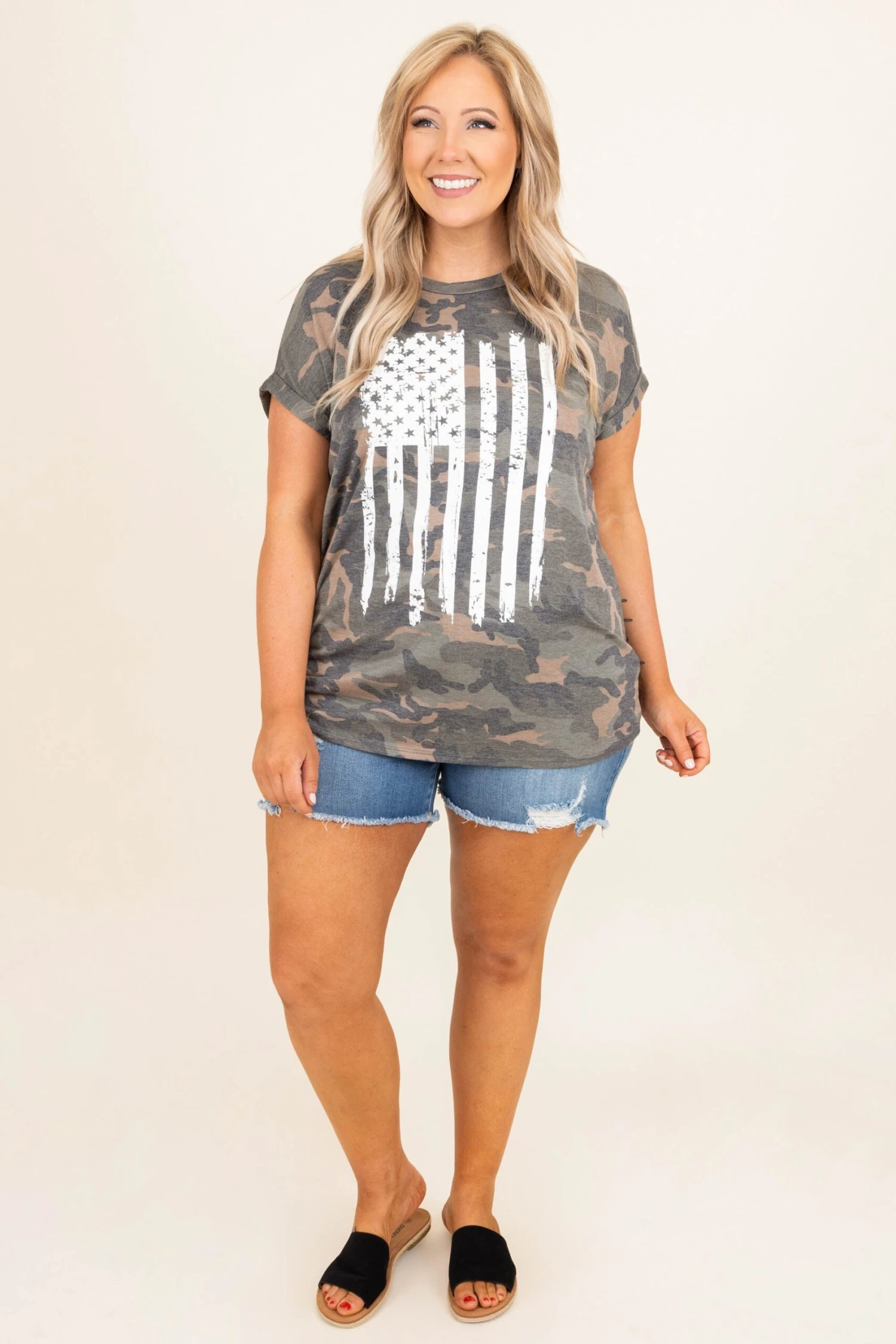 Let your legacy forever be looking amazing! This fun top has a camo pattern with a flag graphic over top that is so cute! We love how soft this cutie is and how good it looks when paired with some sandals and jean shorts!