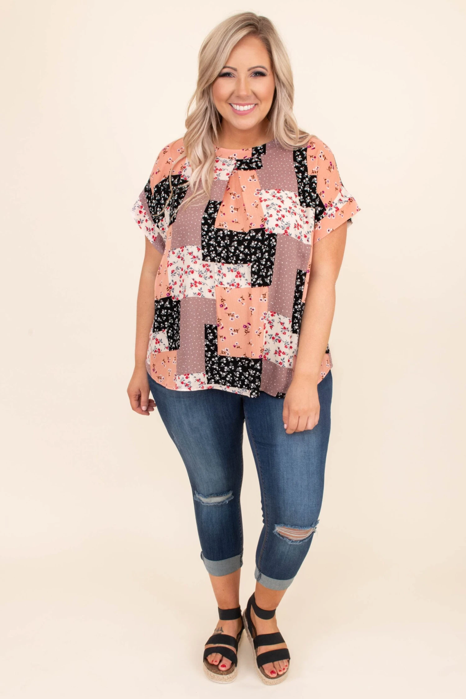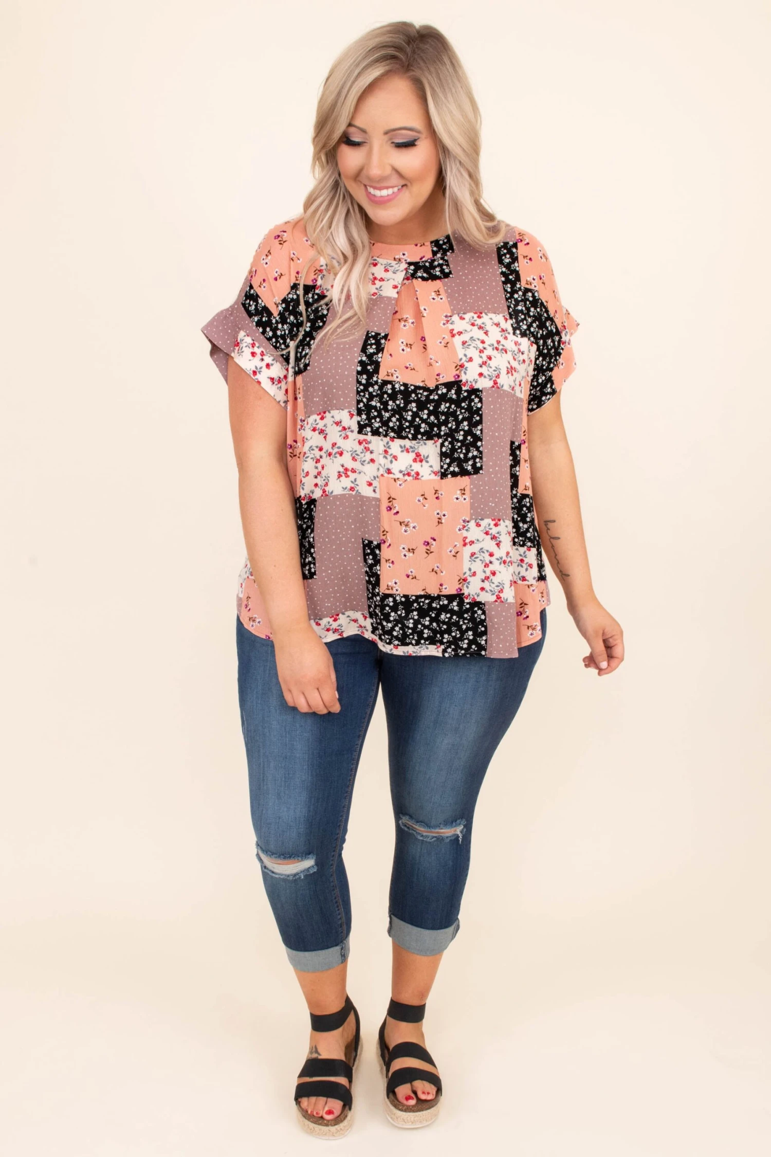 We absolutely love this blouse! This blouse has a trendy patchwork floral pattern with colors that are perfect for the season! It’s comfortable for all day wear, has a flowy fit, and can be styled with your favorite shoes and accessories! Simply, pair this blouse with skinnies or shorts for an effortlessly chic look!