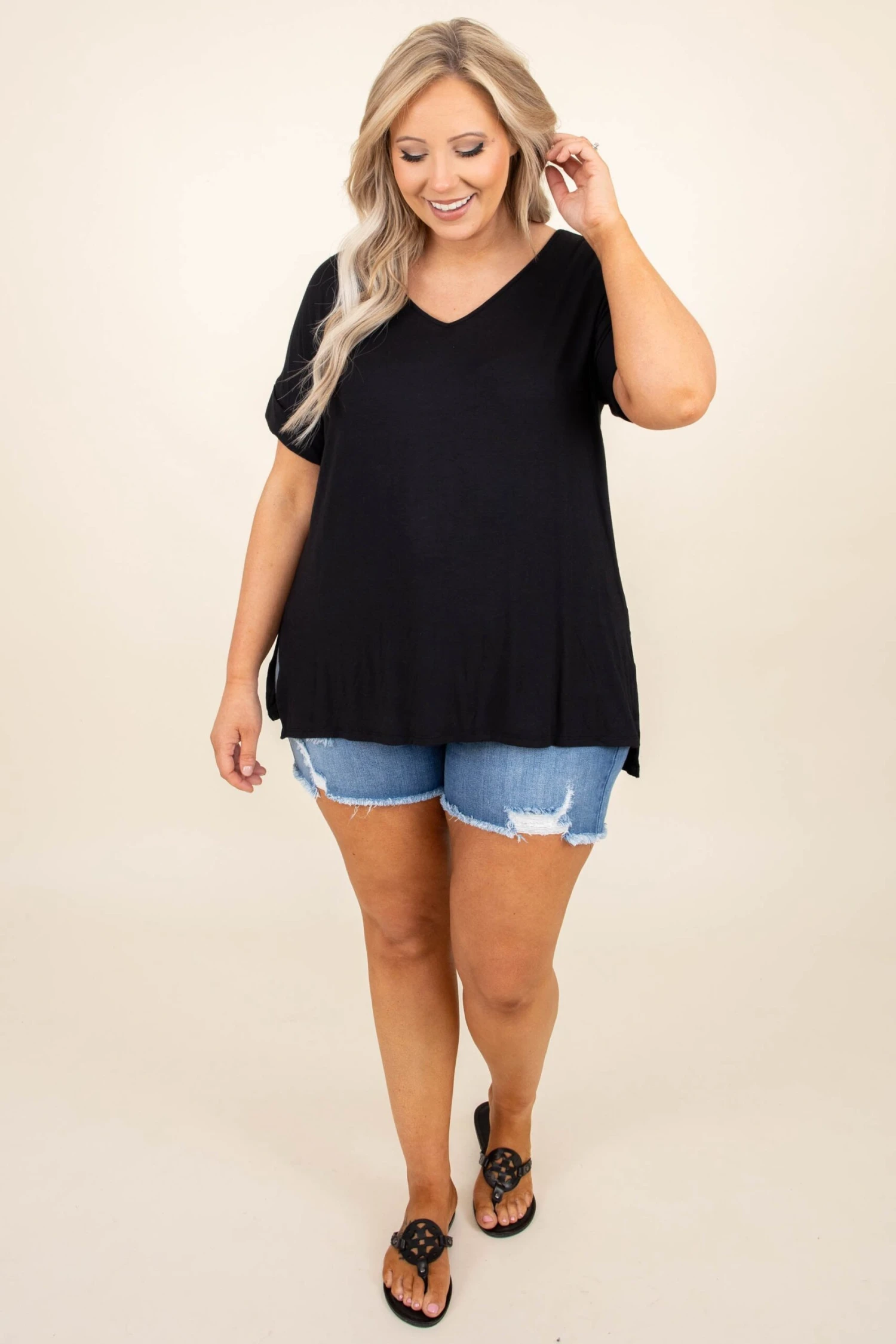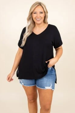 We have a grand appreciation for this top! This basic cutie is perfect to match with everything with it’s solid black color and simple style! The material is SO soft and the cuffed short sleeves are so stylish! Pair this top with some shorts and a fun accessory for a casually chic look!Â
