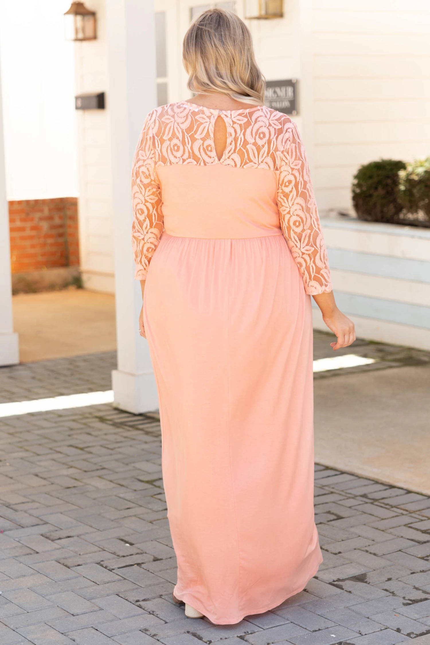 Look oh so elegant in this beautiful dress! This dress has a solid peach color you can style with your favorite shoes and accessories! It’s comfortable for all day wear, has a figure-flattering fit, and features the prettiest lace sleeves! Style this dress with heels or wedges for your next event!