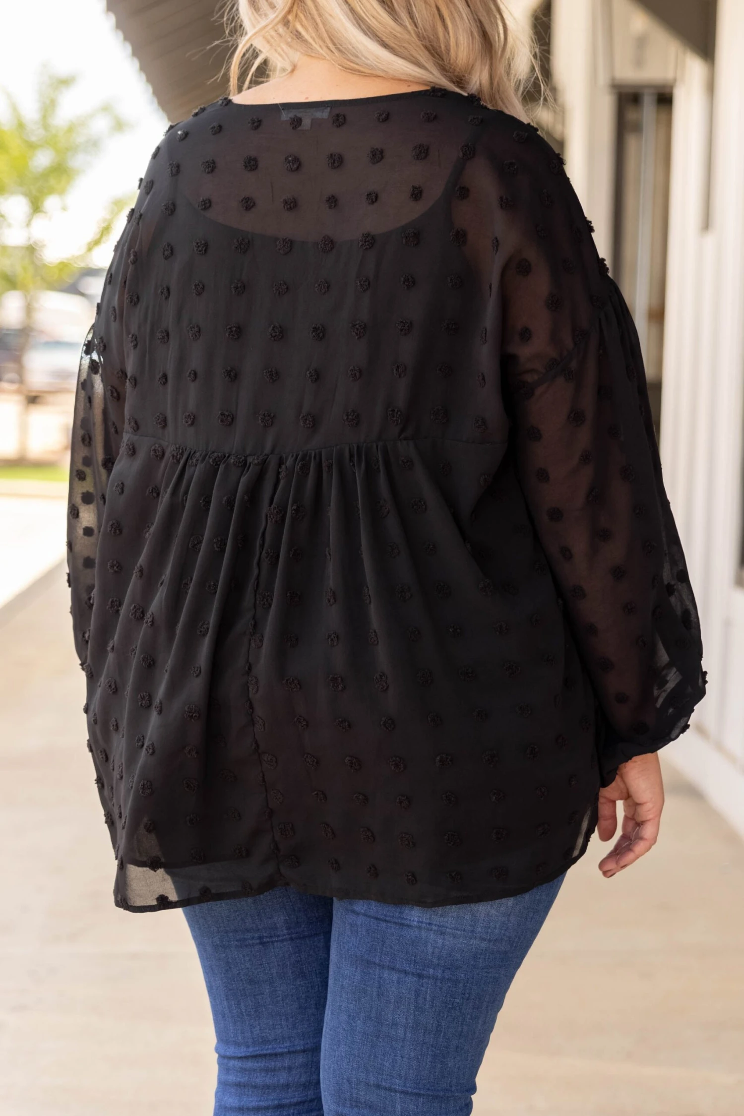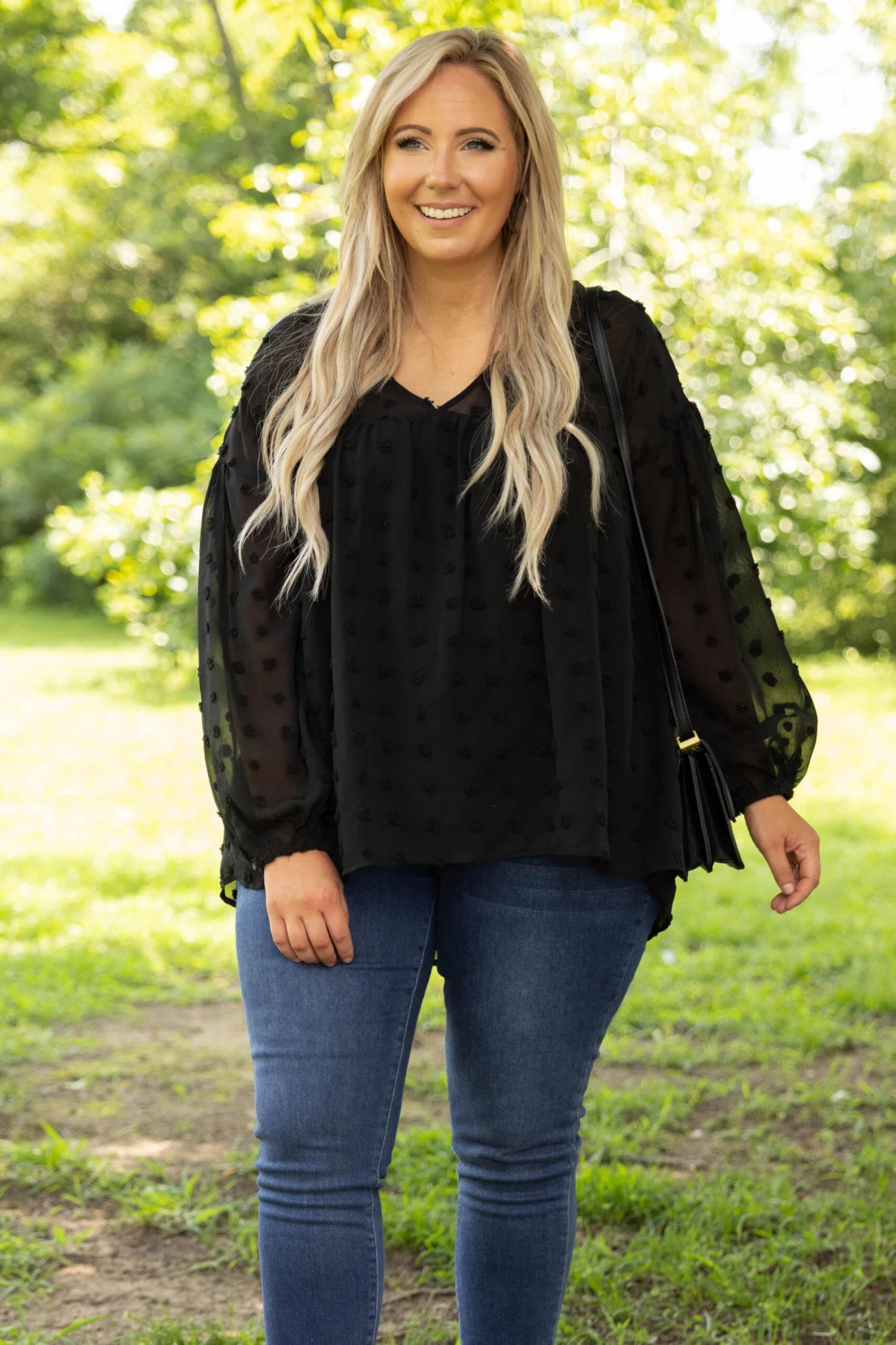 This blouse has caught our attention! This top is simple and chic! This top has a solid neutral color with a textured fabric we adore! It’s easy to style, has a figure-flattering fit, and features an attached under-lay for the ultimate look! Style this blouse with skinnies and wedges for your next event!
