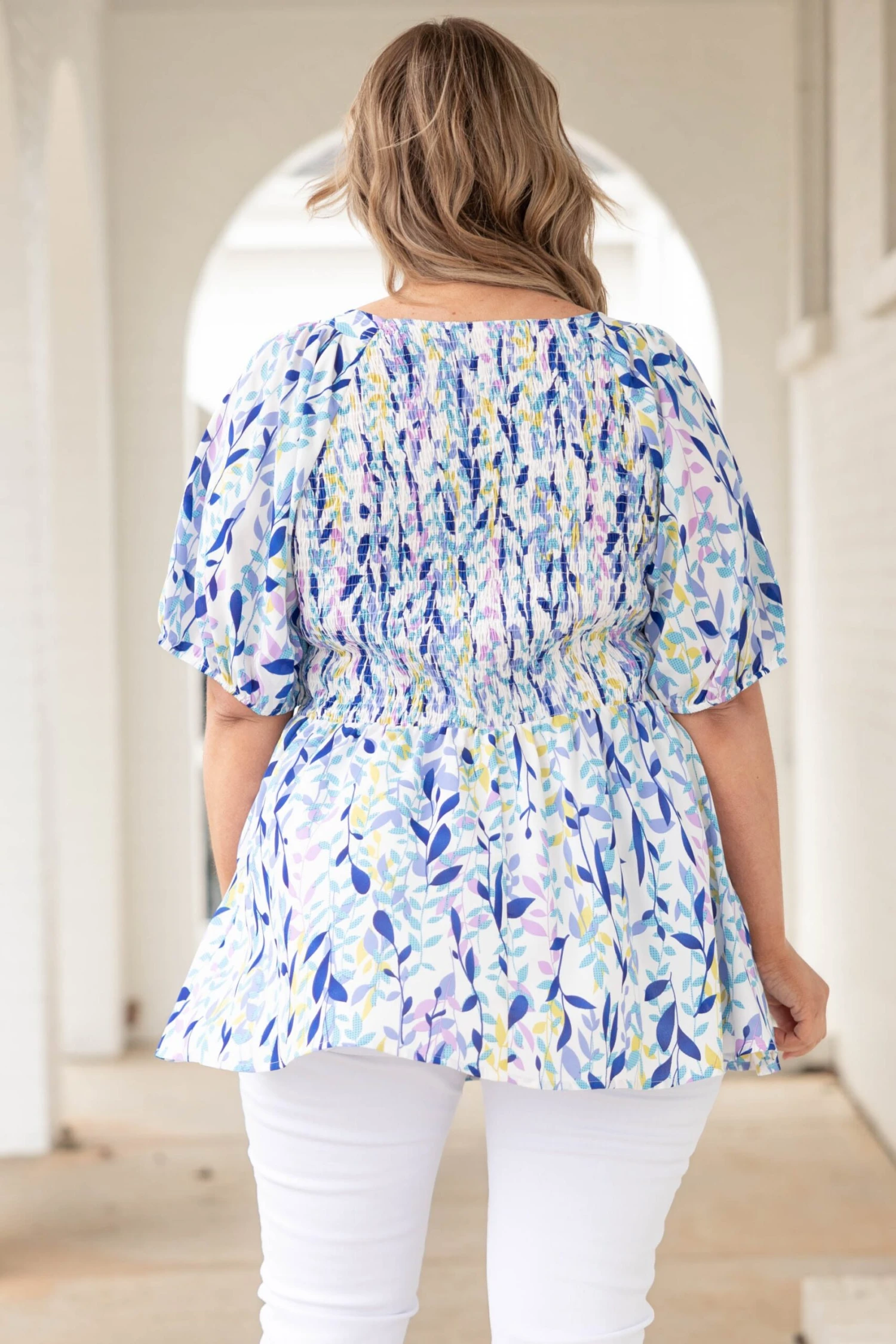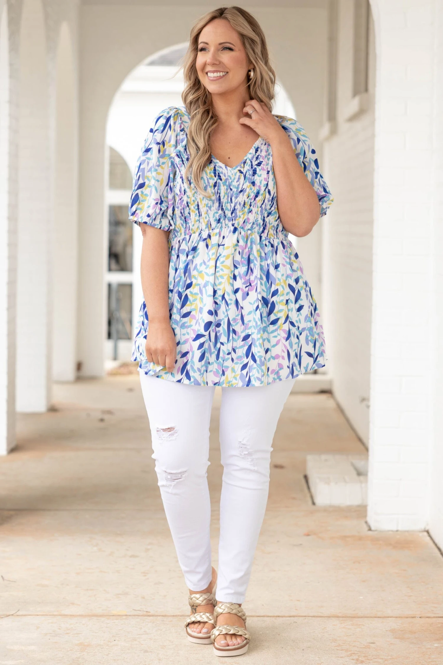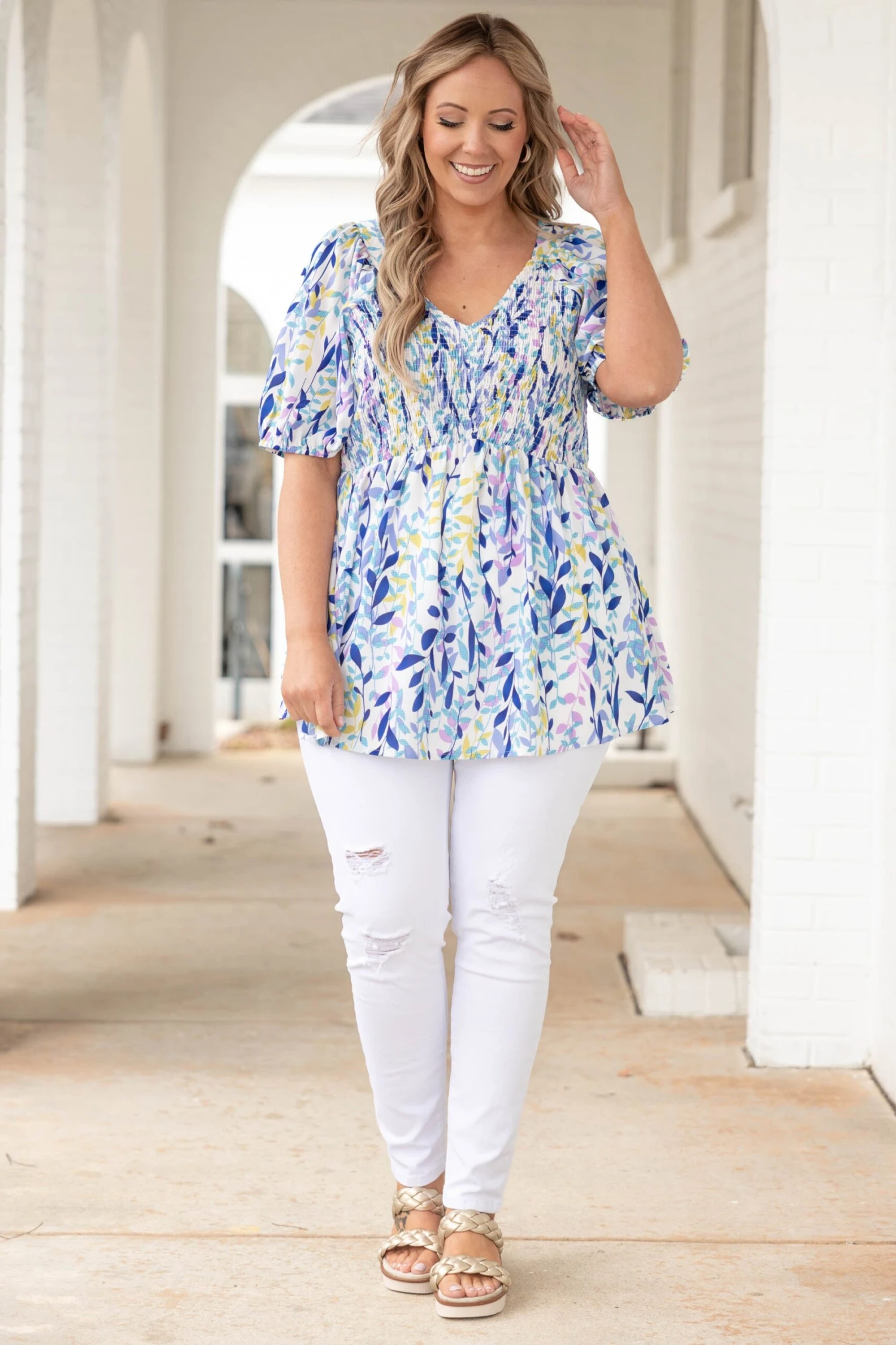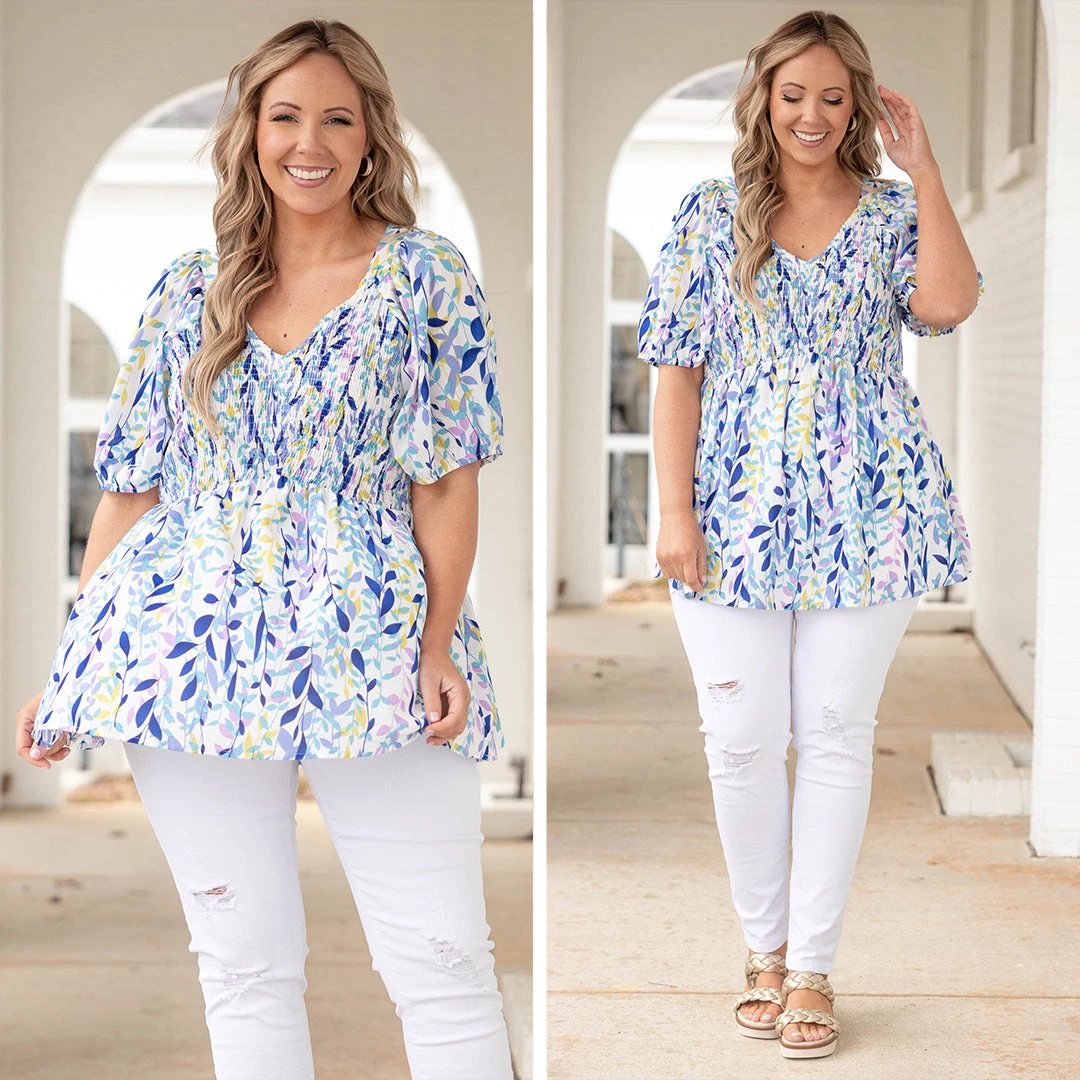 Take this lovely top on your next adventure! It has a beautiful color with a floral pattern that is so easy to pair with your fave bottoms and accessories! The smocked bodice is super chic! The stretchy, flirty fit look good paired with some white denim and heels for a classic chic look!
