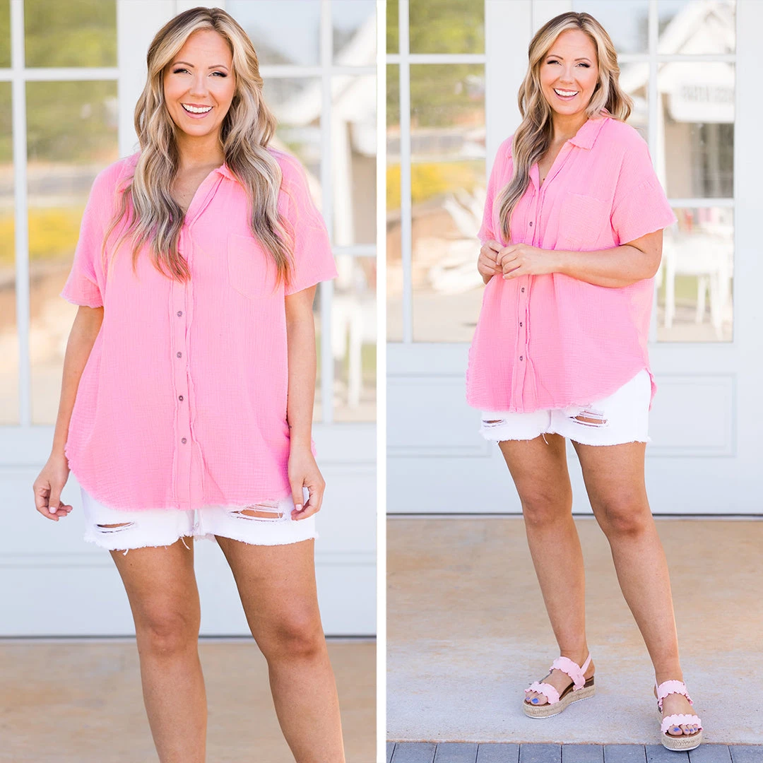Today is the day to grab this cutie! This top has a fun, dark pink color with a textured design that is so easy to style with all of your favorite shorts and jeans! This top is perfect for a casual day out!
