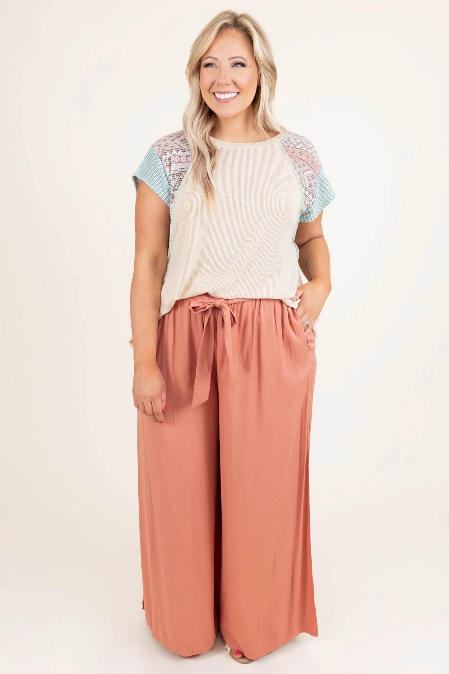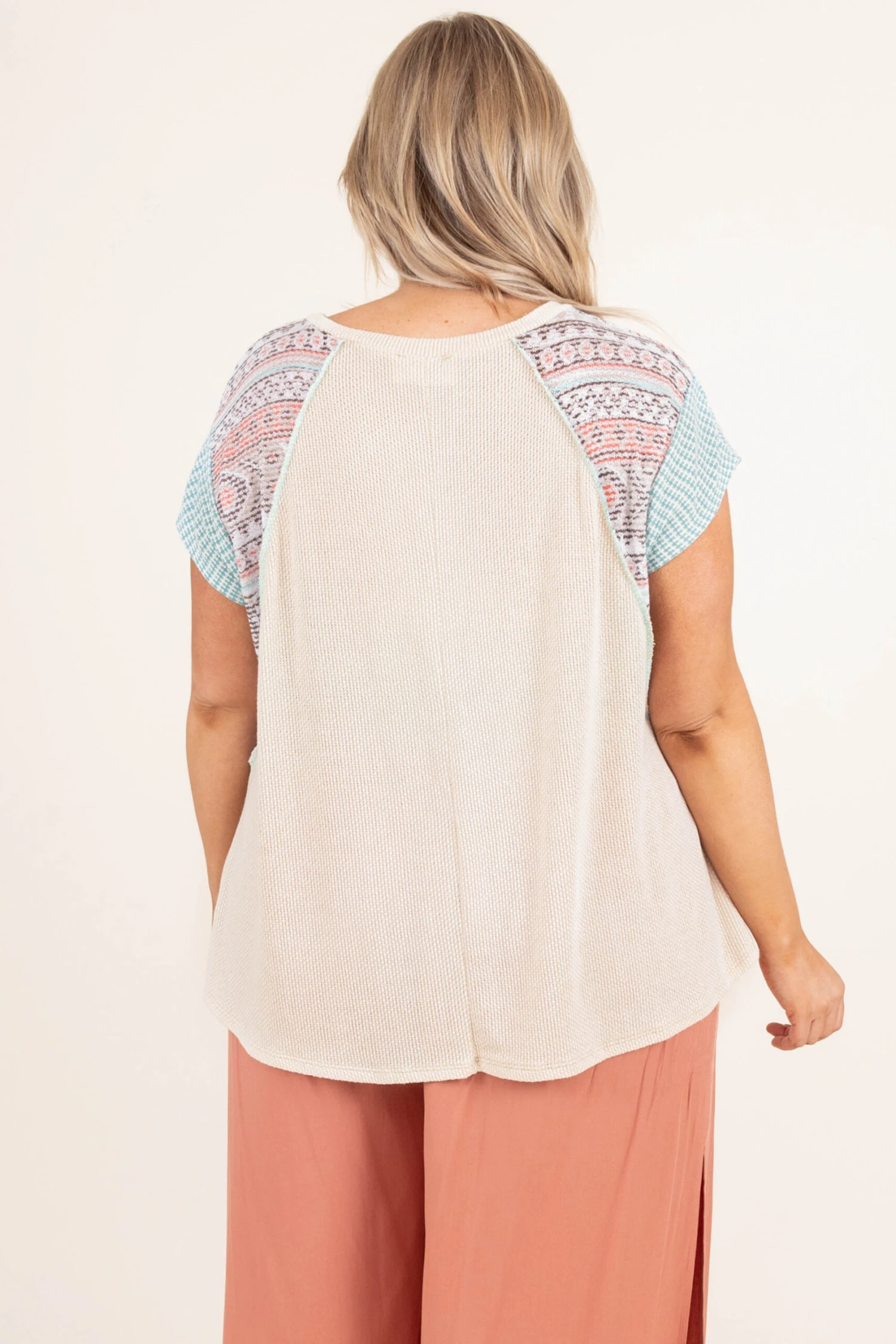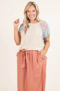 This is no ordinary top! The fun knit pattern is so stylish and the neutral colors are perfect for pairing with anything! We love how cozy this material is and the fun Aztec-inspired print on the sleeves is so trendy! Style this with some pants and sandals for the perfect look!