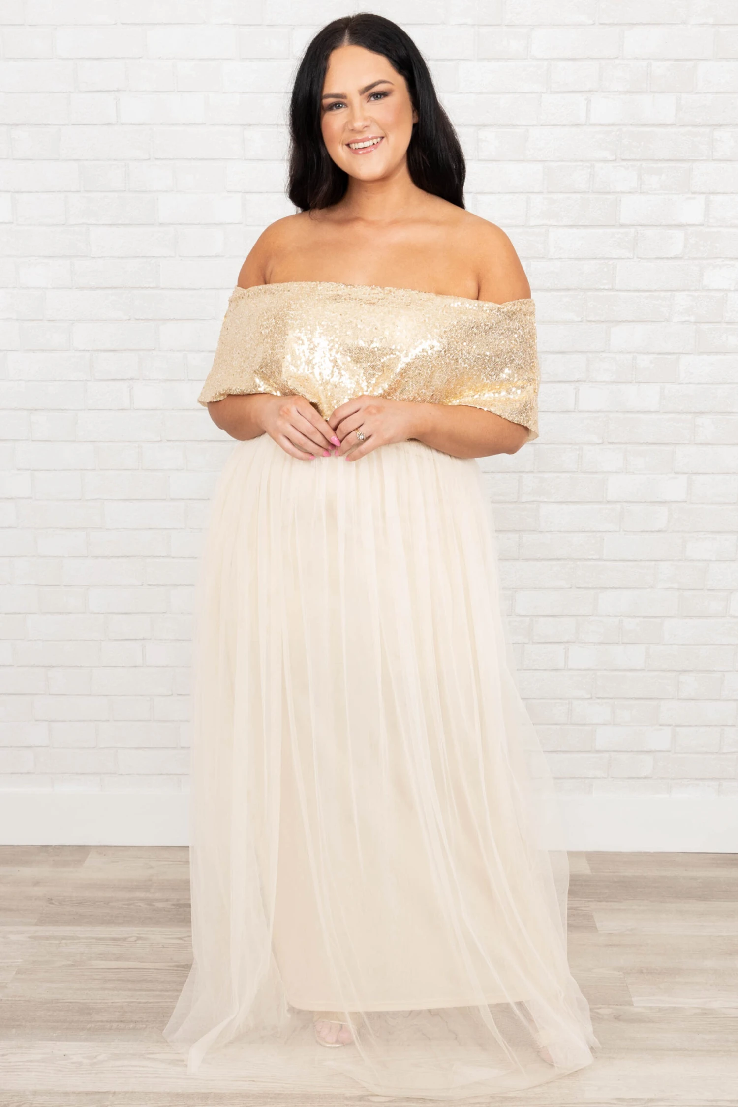You will feel as posh as a princess in this dress! The gold color is so stunning and the tulle skirt is perfect for dancing and twirling! The off-the-shoulder look is so trendy and the flowy style will keep you so comfy! Style this with some heels and delicate accessories for a totally elegant look!