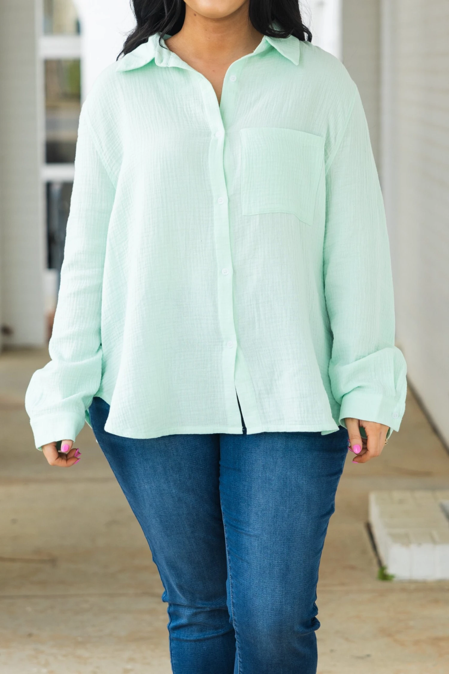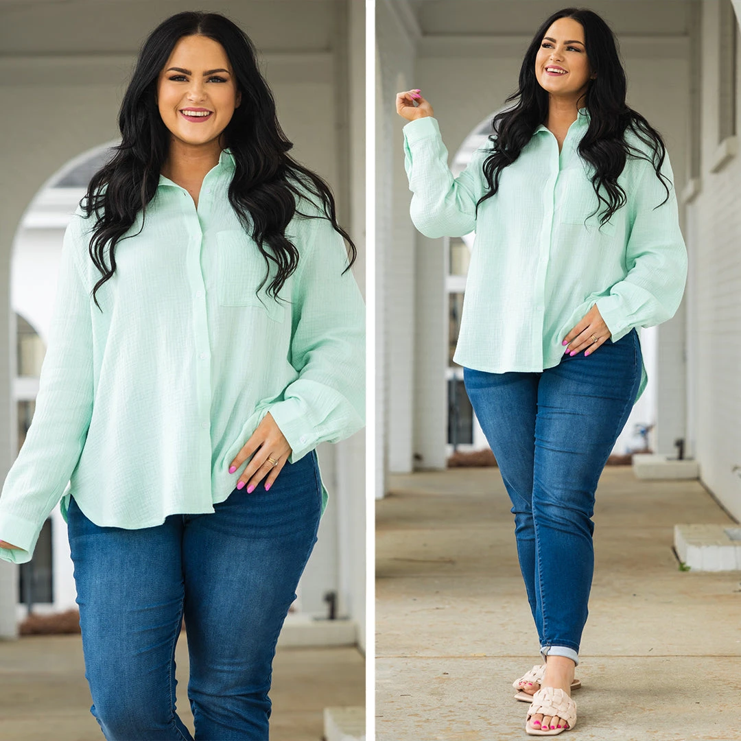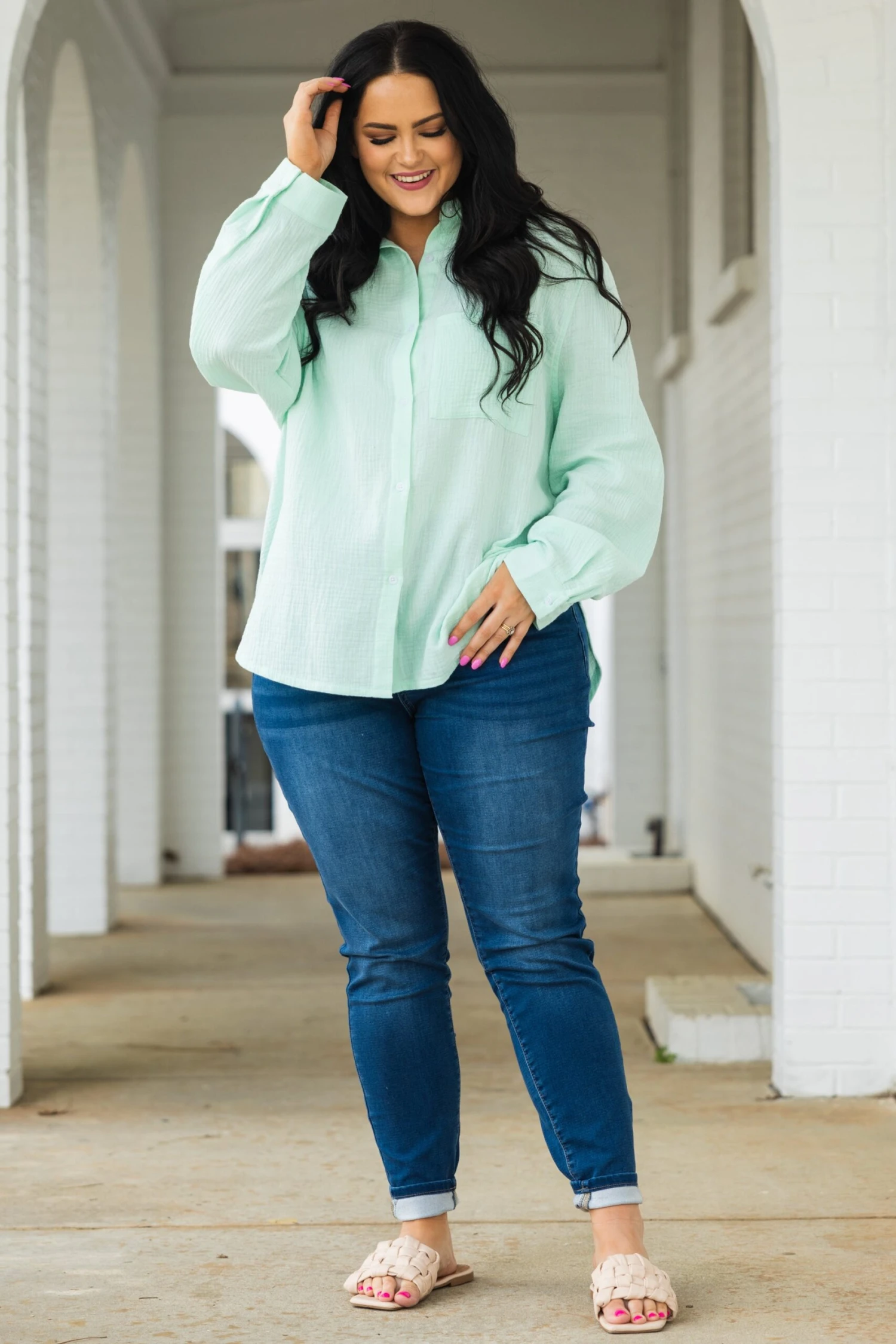 This top was made for soaking up the sun rays! The dazzling mint color and lightweight design is perfect for a day out on the town! The textured style and flattering fit is just what you need in your new fave top! Simply style this top with a cute cami and skinnies for an everyday chic look!