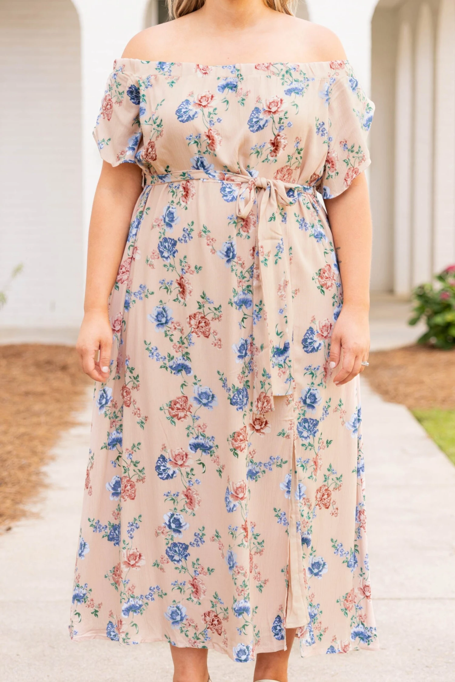 This dress will be your reason to go out! The dusty pink color is feminine and sweet and the slit gives this a flirty feel! The off-the-shoulder look is so trendy and the tie at the waist will accentuate the best parts! Style this with some wedges and heels for the perfect look!