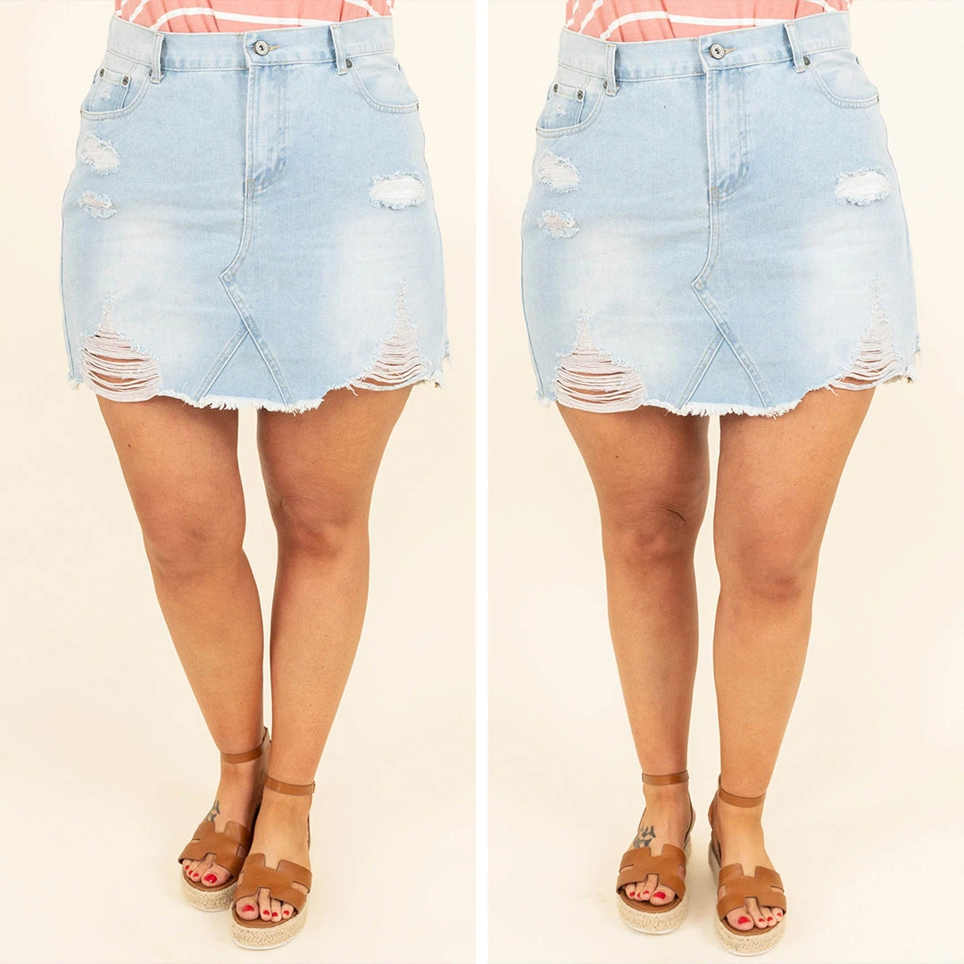 We love this light denim skirt! This cutie has the perfect amount of distressing and a trendy raw hemline. Simply pair this with your favorite summer top and cute sandals for a fun and flirty look!