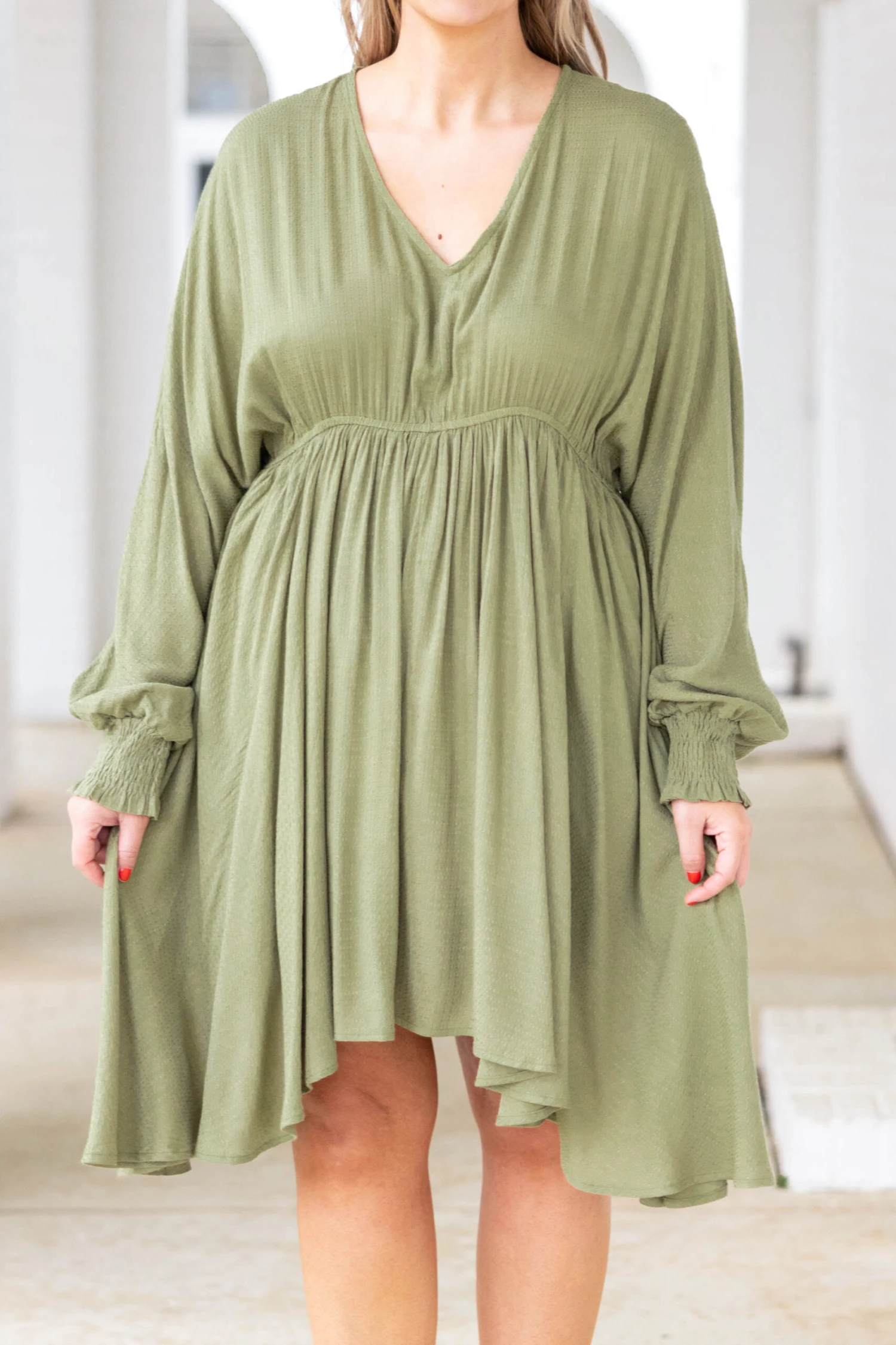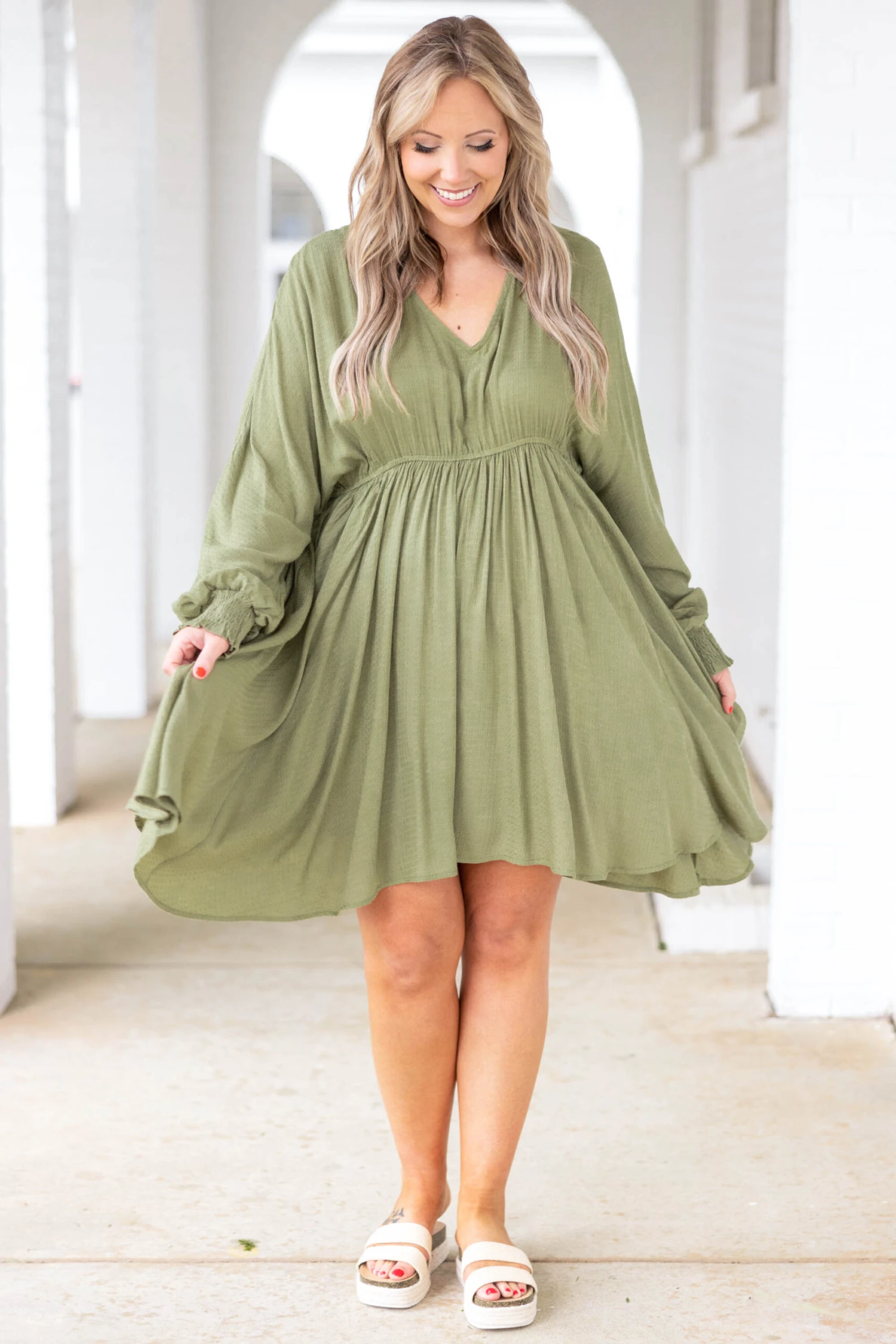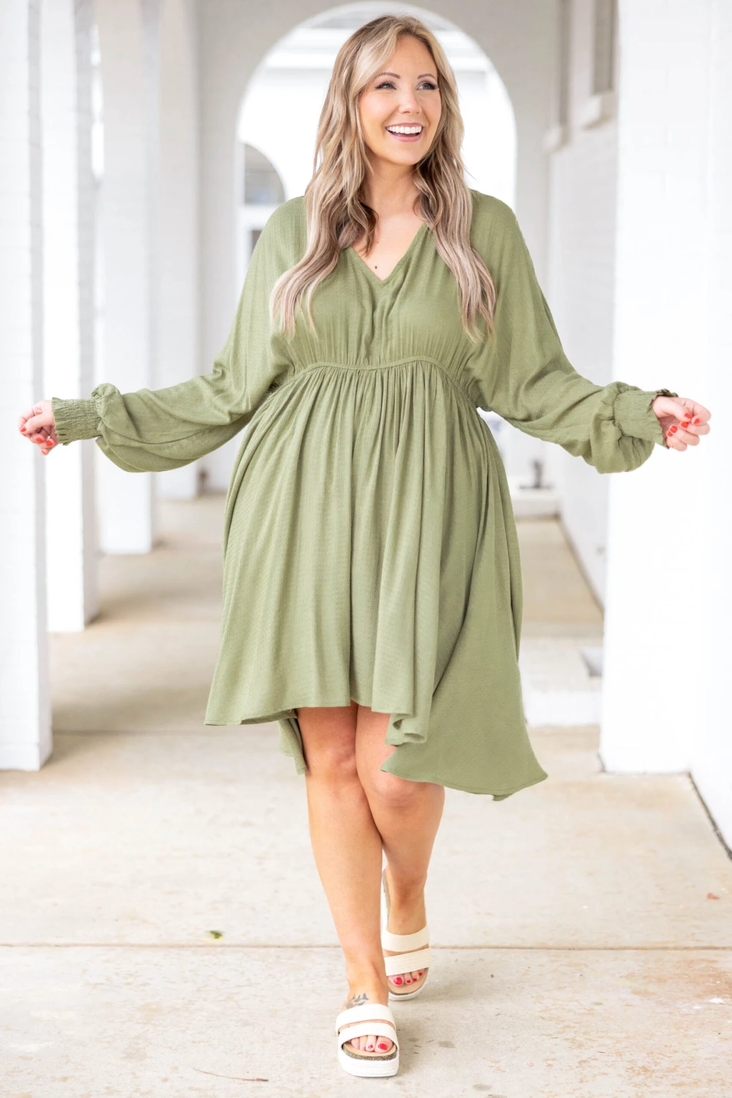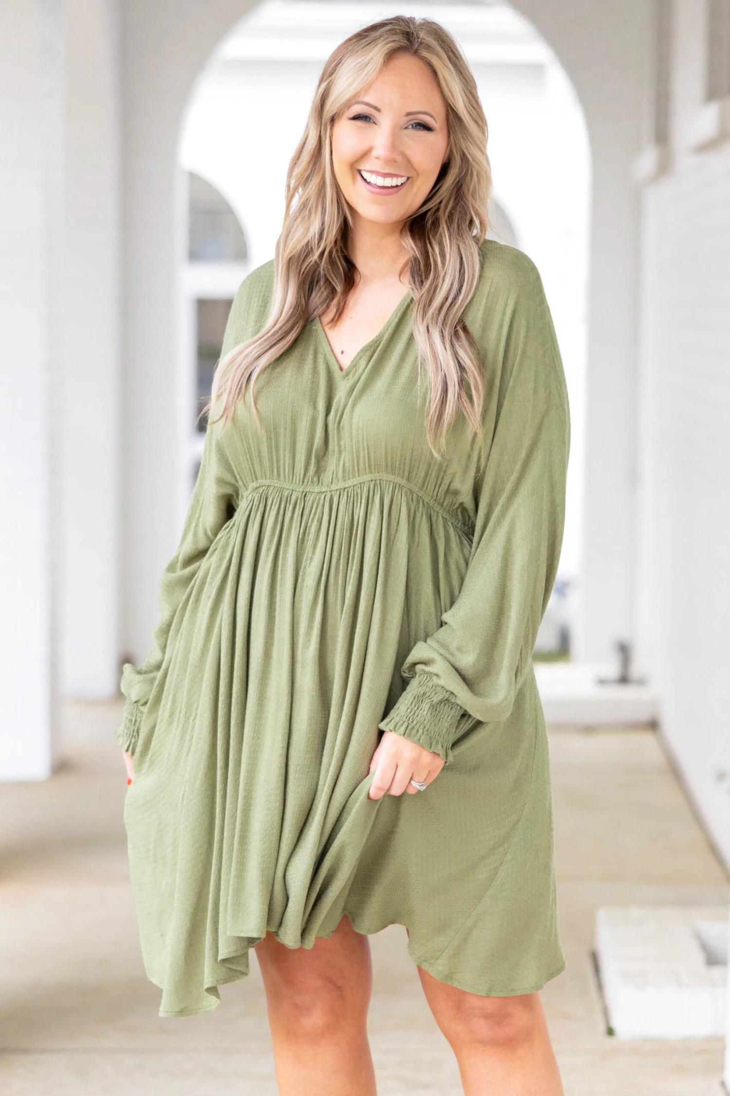Listen to your heart and get this dress today! It’s a must-have for the season! It has a beautiful olive color, a super flattering fit, a cool textured fabric and smocking on the sleeves. Style it with a cute accessories and sandals to complete the look!