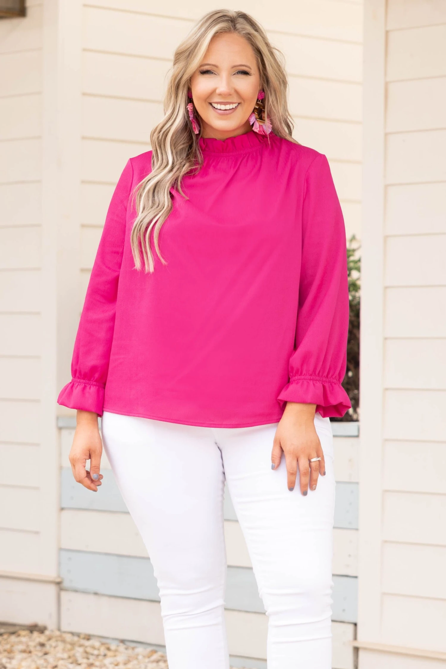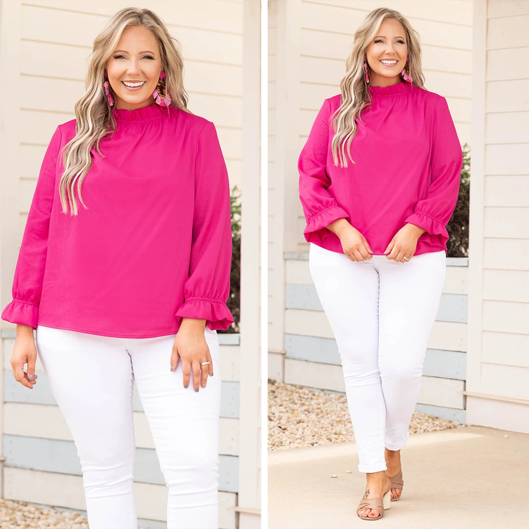 Go for a sweet look in this top! This cutie has a fuchsia color that you can dress up or down for any occasion! The high neck look is so fashionable and the long sleeves are so pretty! Pair this cutie with some white skinnies and heels for a statement-making look!