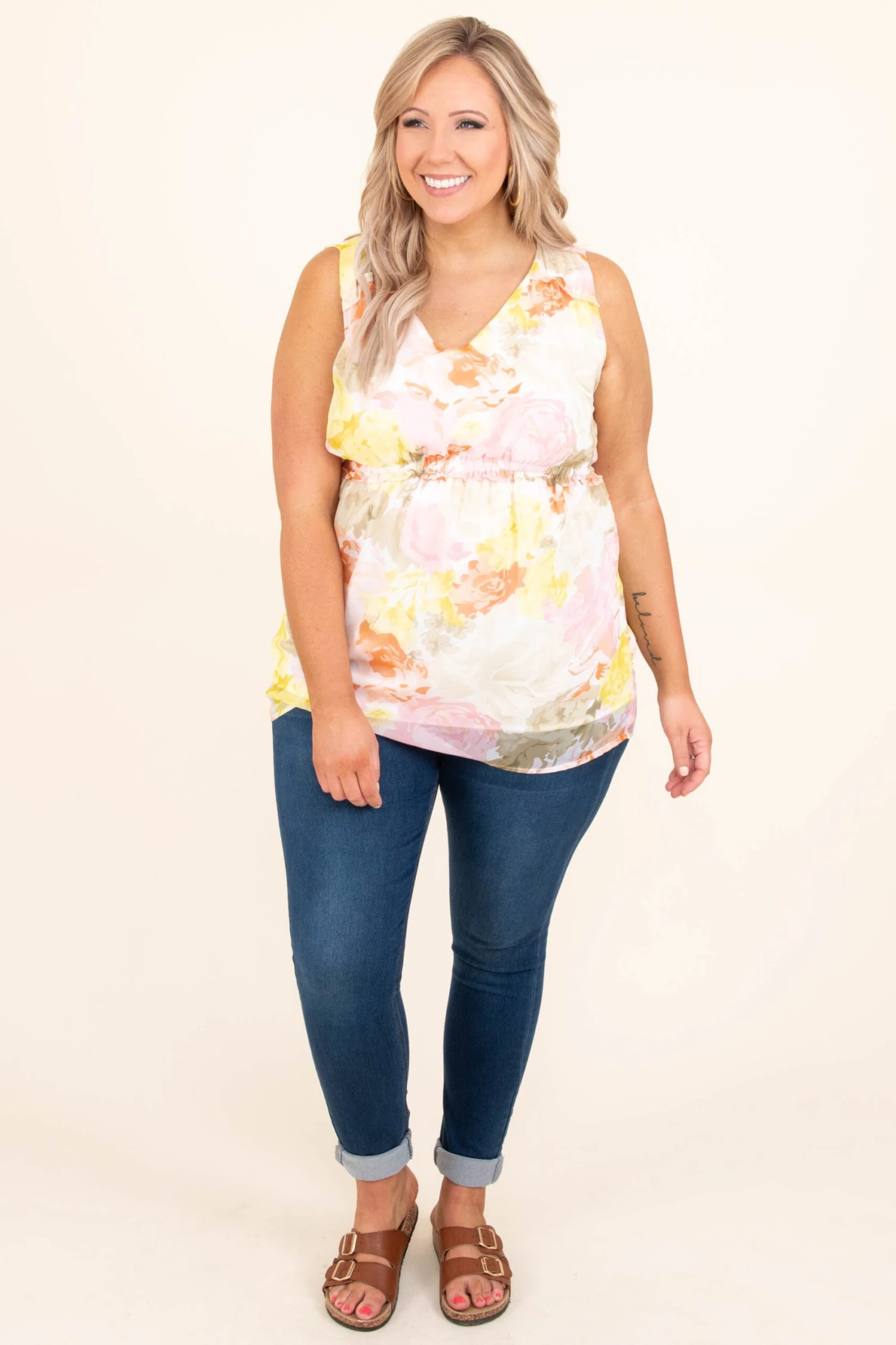 Get out and feel a sweet sunlight breeze in this top! The large floral pattern is so dreamy and the v-neck and cinched waist are so flirty! Pair this cutie with some skinny jeans and sandals for an easy but stylish look!