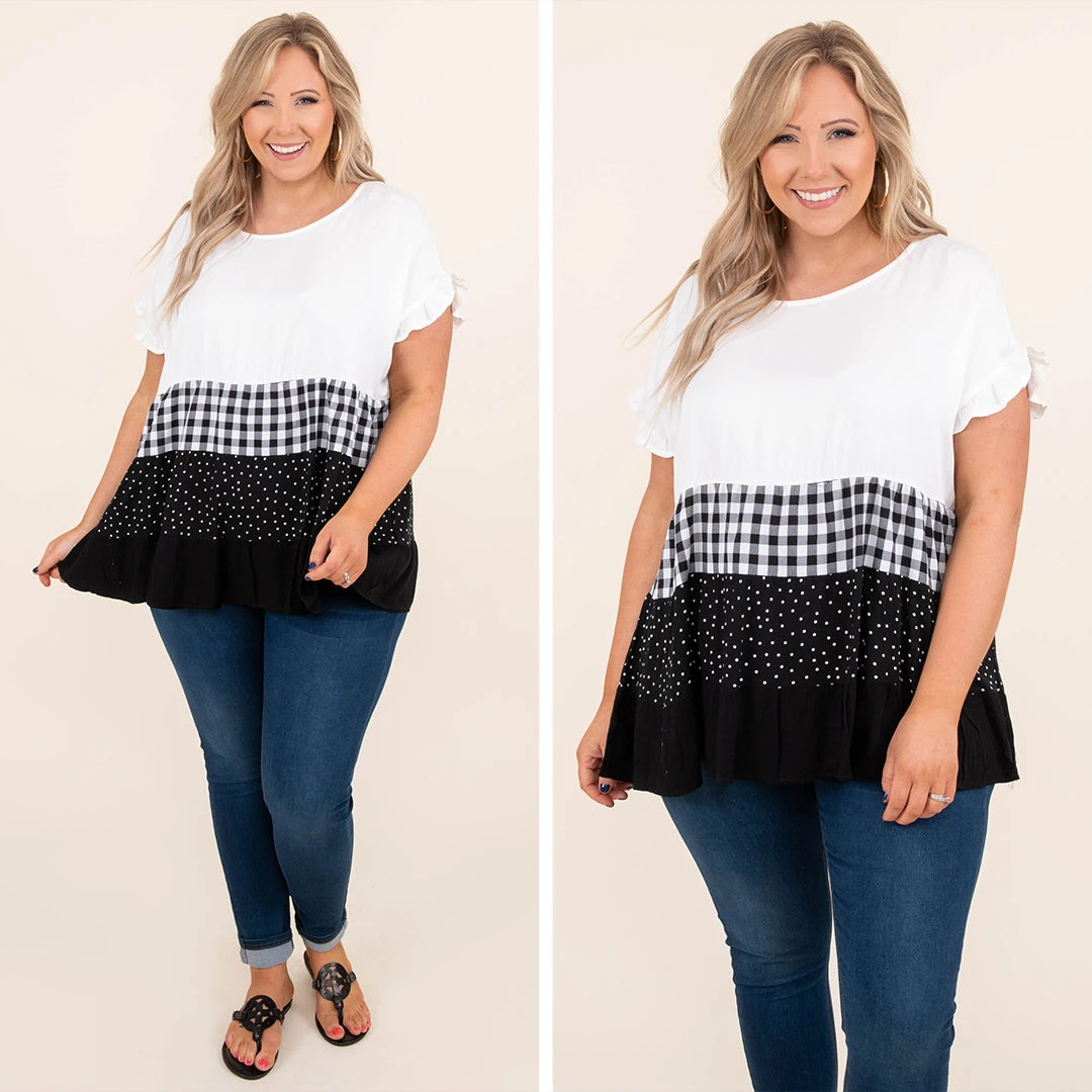 We can’t get enough of this top! The pattern blocking is so chic and the flowy fit makes it so comfy! The neutral colors can be paired with anything and the ruffle sleeves give this cutie a little something extra! Style this with skinnies and sandals for the perfect look!