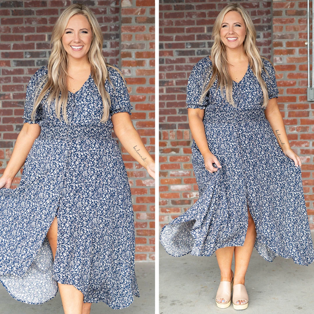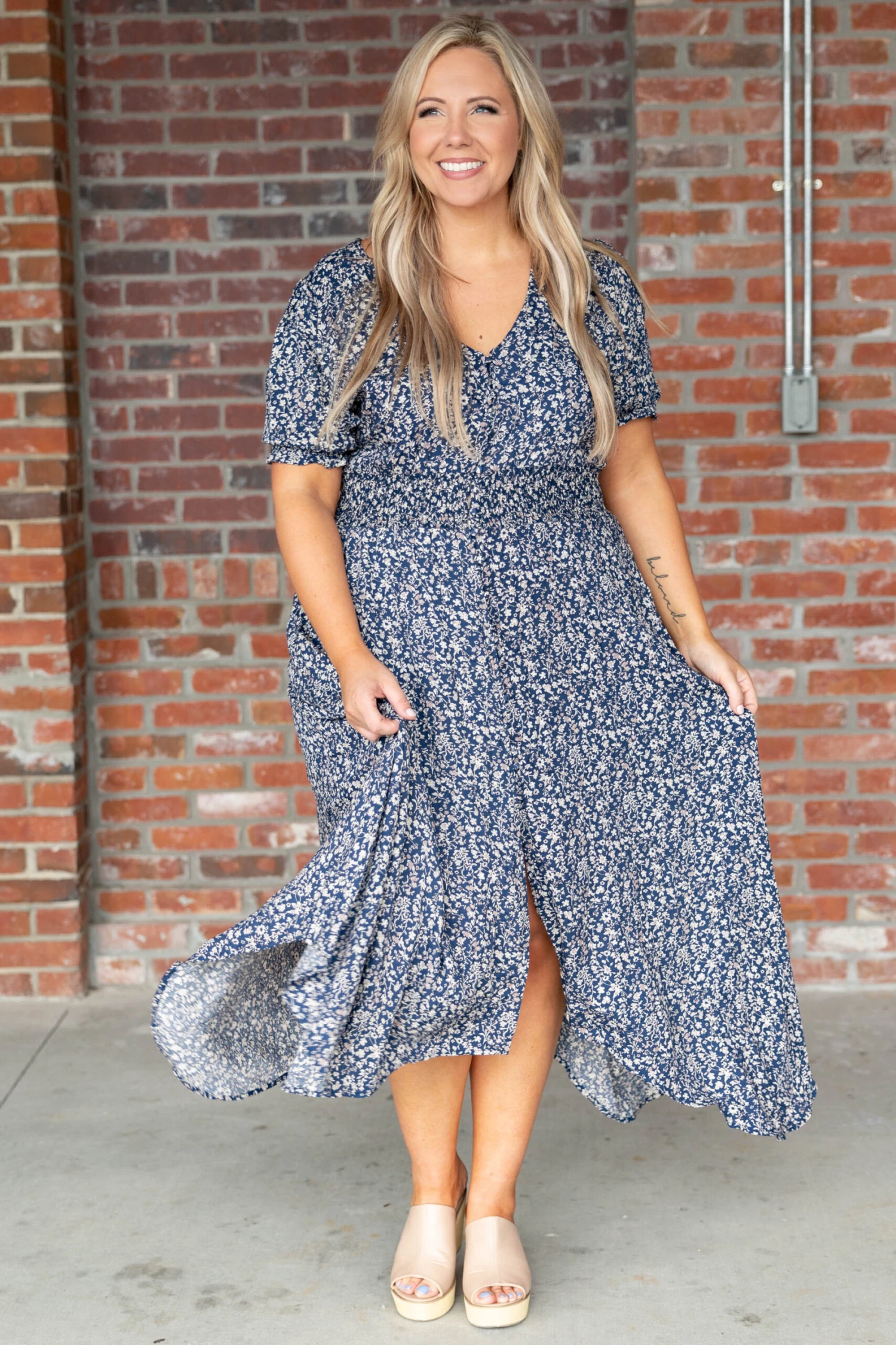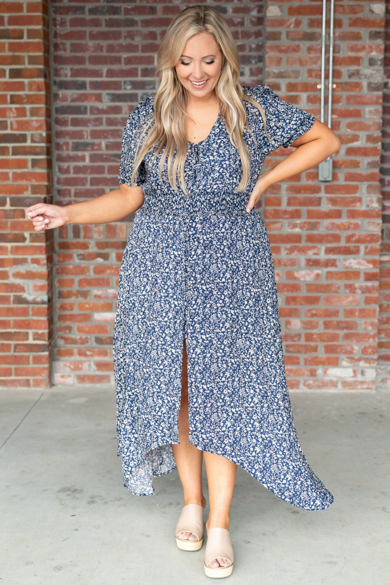 We absolutely love this dress and are so glad you found it! This dress has a pretty floral pattern with a bold navy color that’s perfect for the season! It’s comfortable for all day wear, has a figure-flattering fit, and features a maxi-length for the ultimate look! Pair this dress with sandals or wedges for an effortlessly chic look!