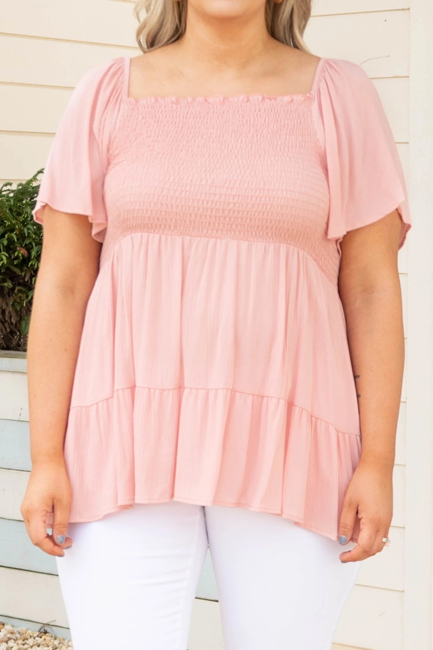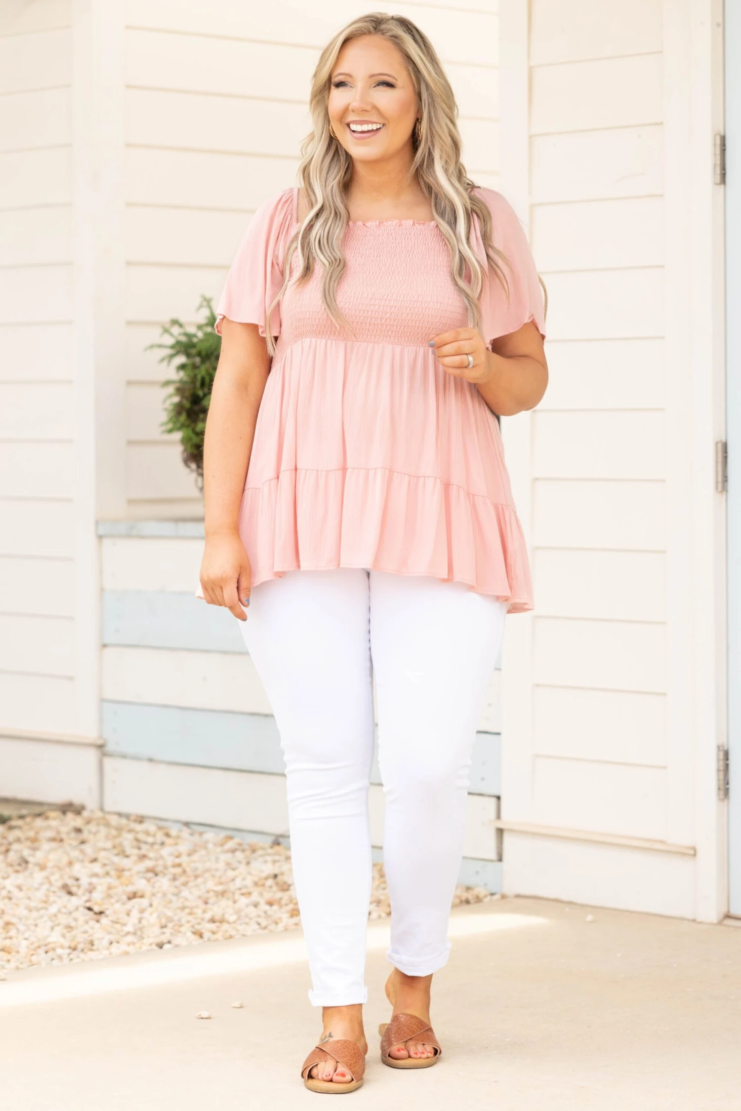 You need this top in your life! The mauve color is so perfect for this season and the smocked top is sure to flatter! The tiered style looks so good on everyone and the fluttery sleeves are stunning! Style this top with some skinnies and neutral sandals for a totally chic look!