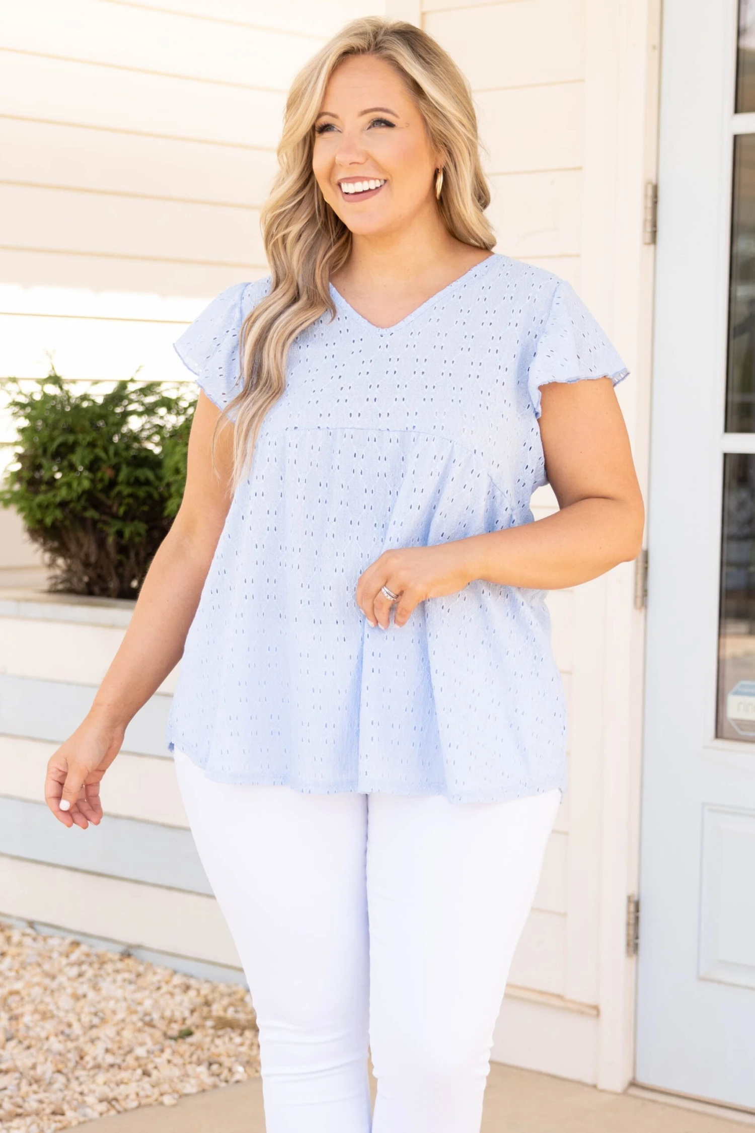 This top is sure to become a favorite! We love the eyelet fabric and soft blue color. With ruffle sleeves and a v-neckline, its perfect for your next brunch outing or date night! Simply pair this cutie with some basic skinnies and sandals for an easy cute look!